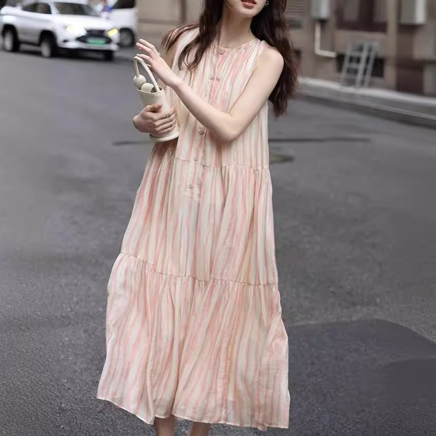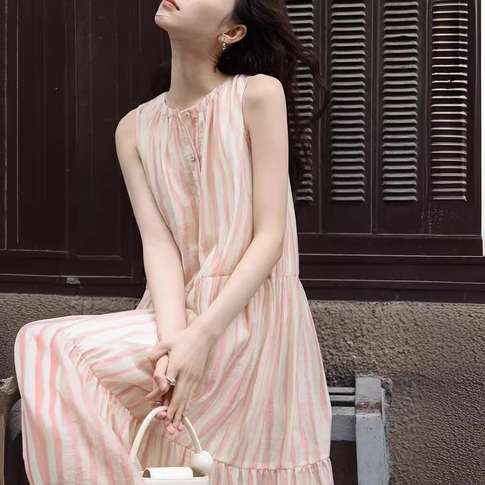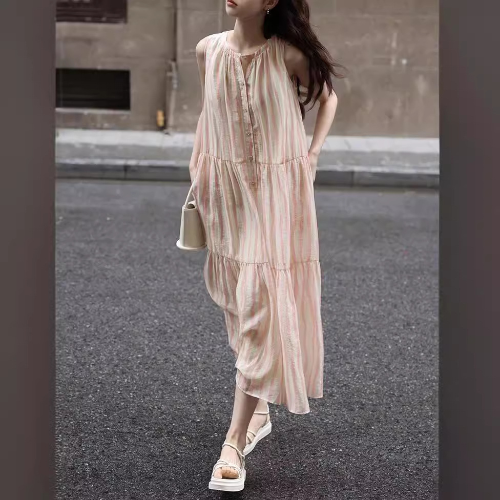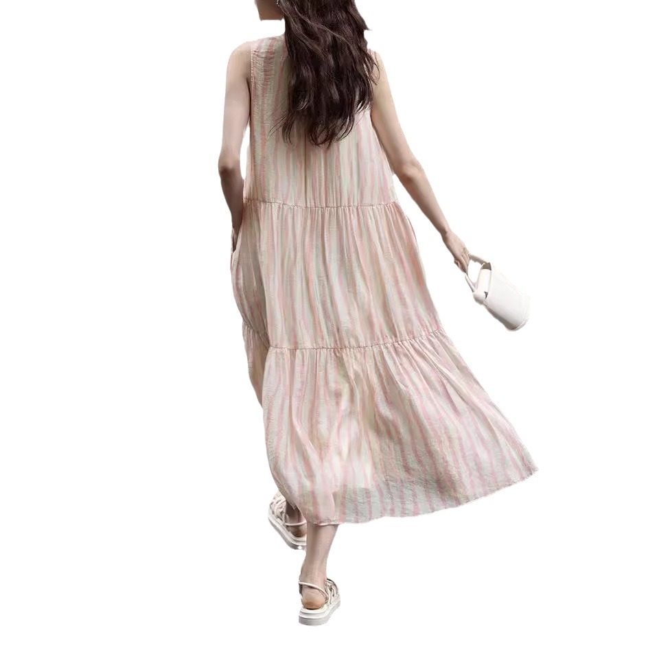 1313气质女神 夏季天丝水波纹粉条纹背心连衣裙垂坠长裙