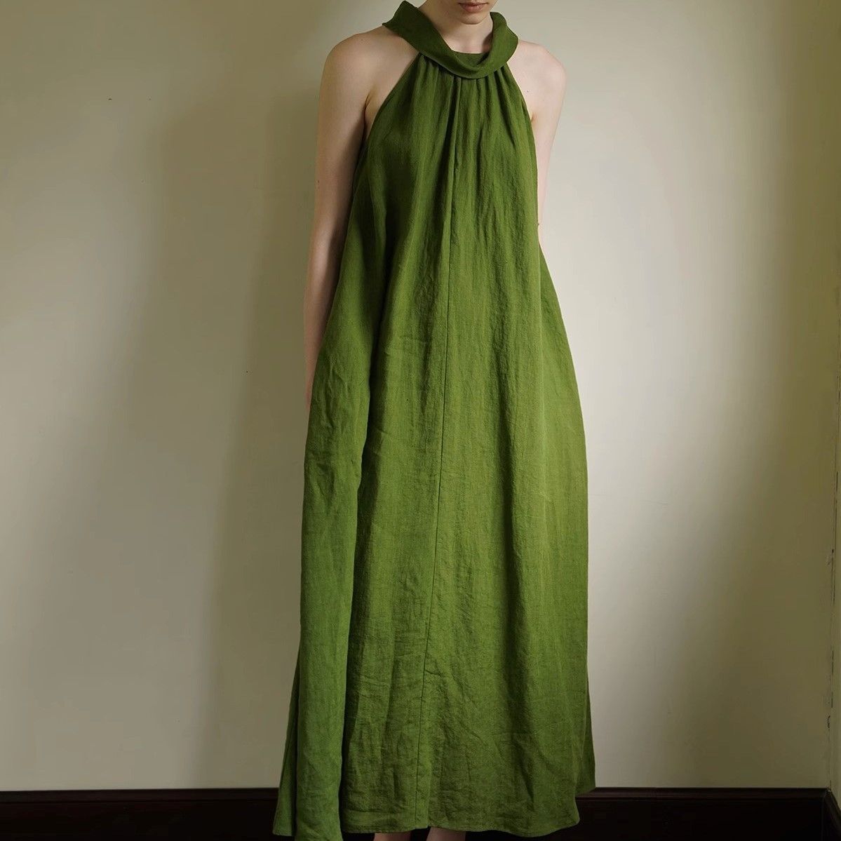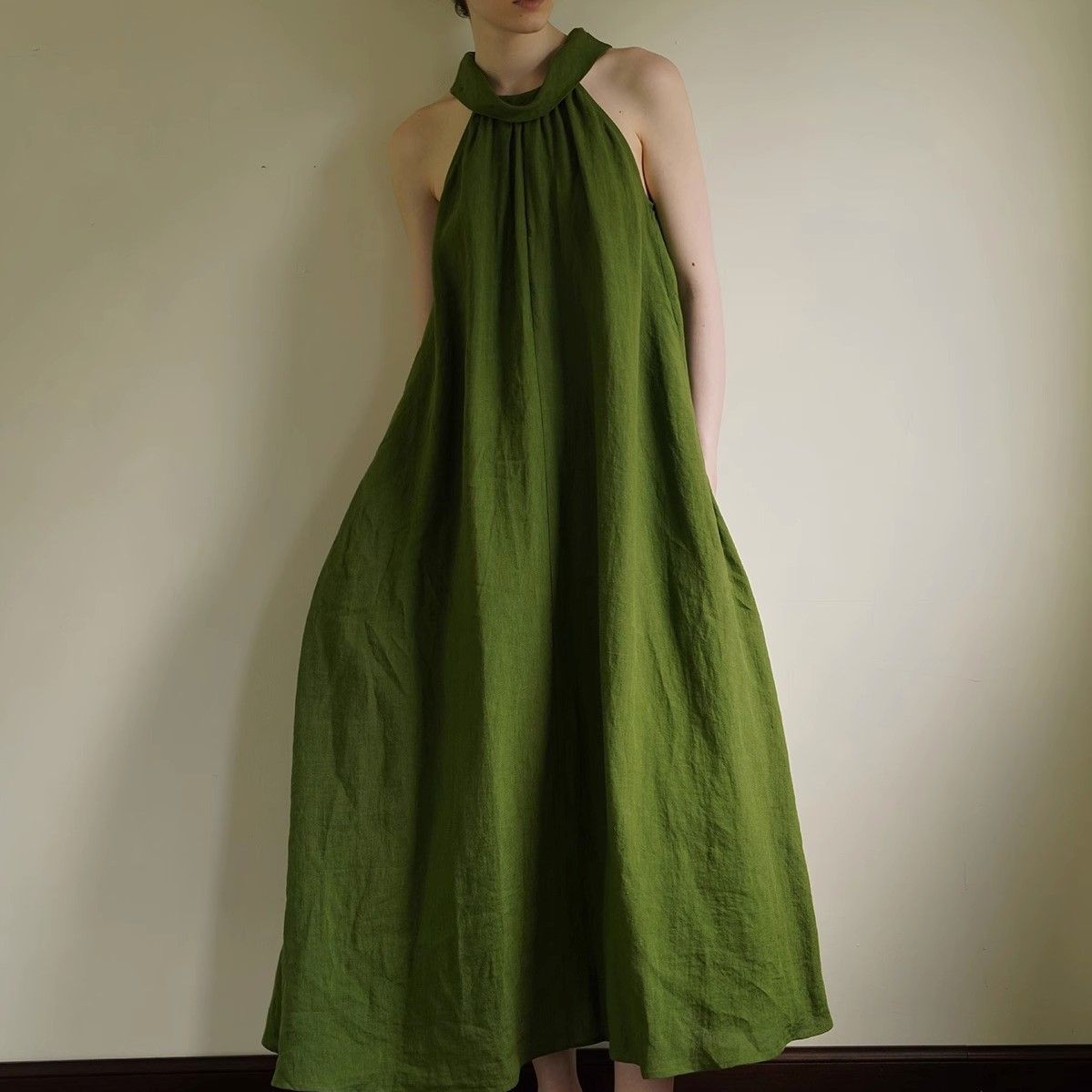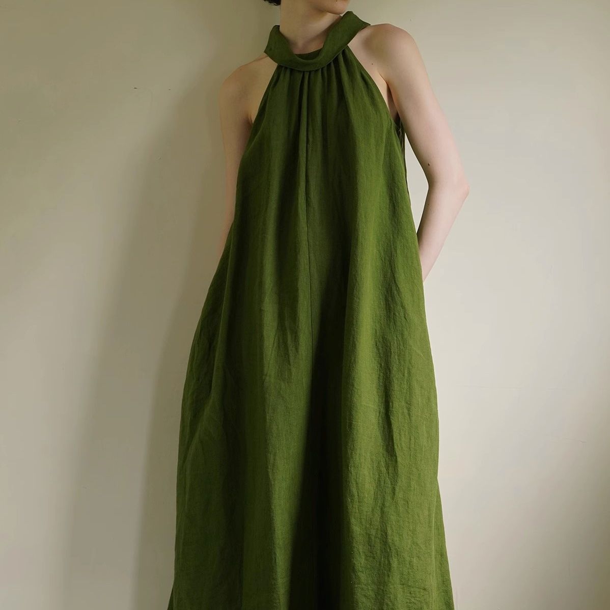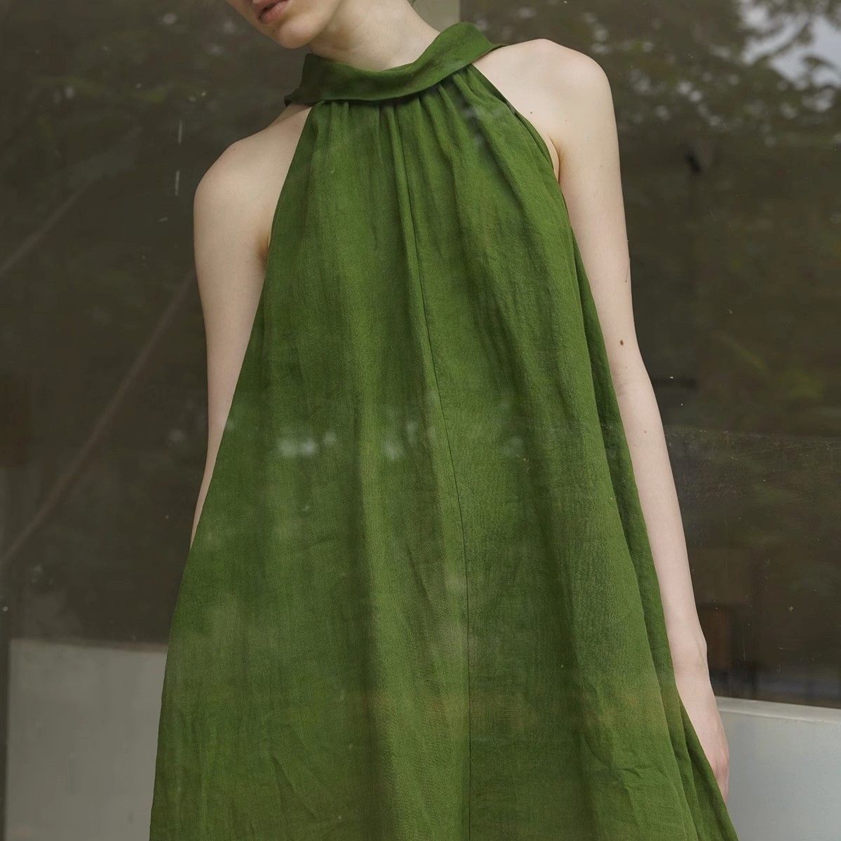 亚麻肌理感砂洗挂脖夏新款小清新气质高级设计质感连衣裙