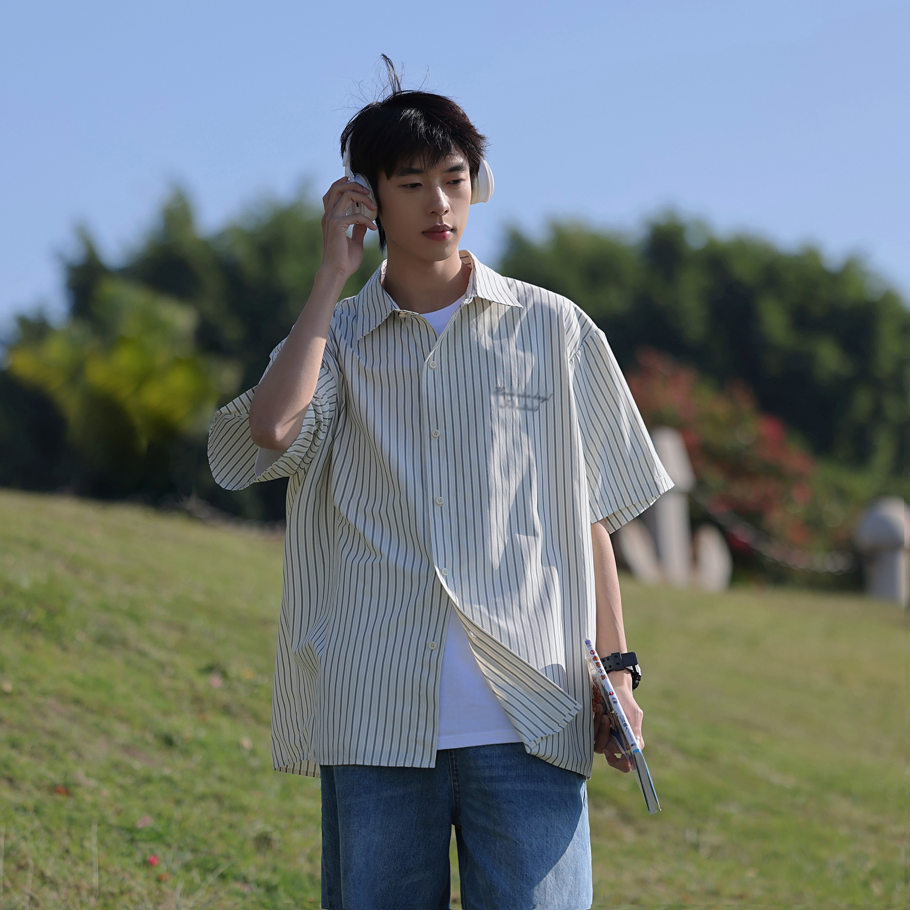 条纹半袖衬衫男士夏季新款日系复古短袖衬衣宽松休闲高街潮牌外套