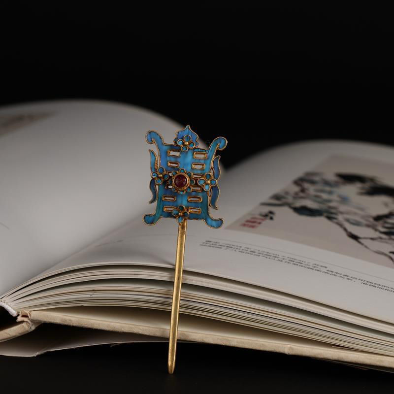 寿字汉服配饰纯银镀金发簪女款旗袍步摇古风烧蓝点翠发饰复古发钗