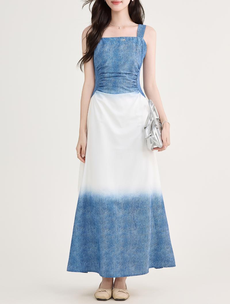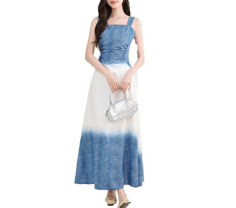 品质推荐~复古渐变牛仔蓝色吊带连衣裙度假风收腰修身显身材长裙