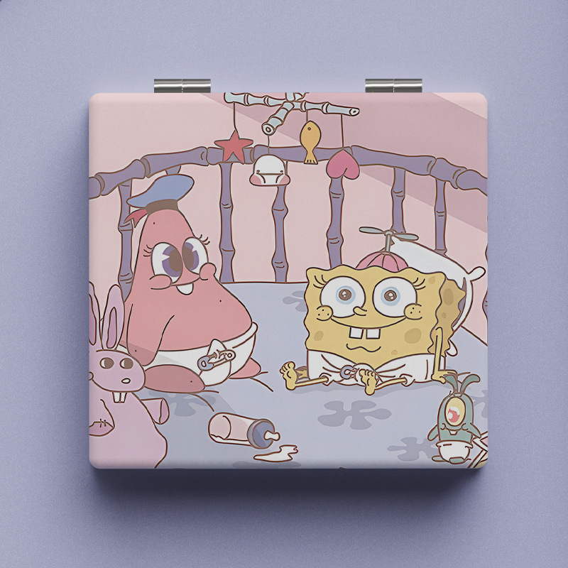 卡通海绵宝宝ins双面镜 PU皮面少女心学生随身携带折叠迷你小镜子