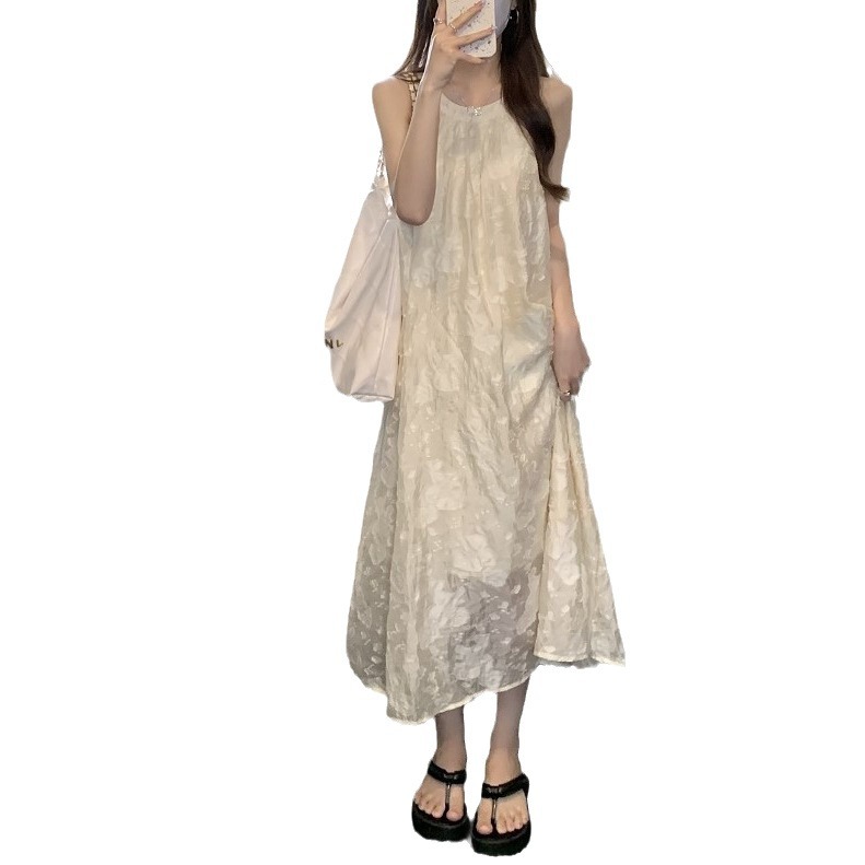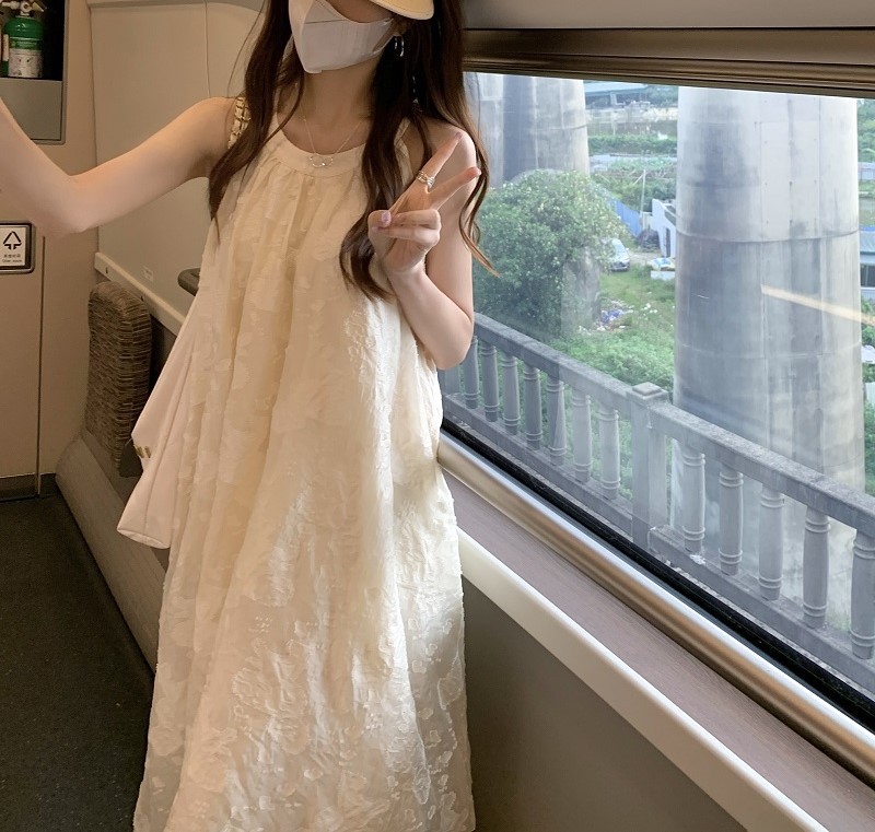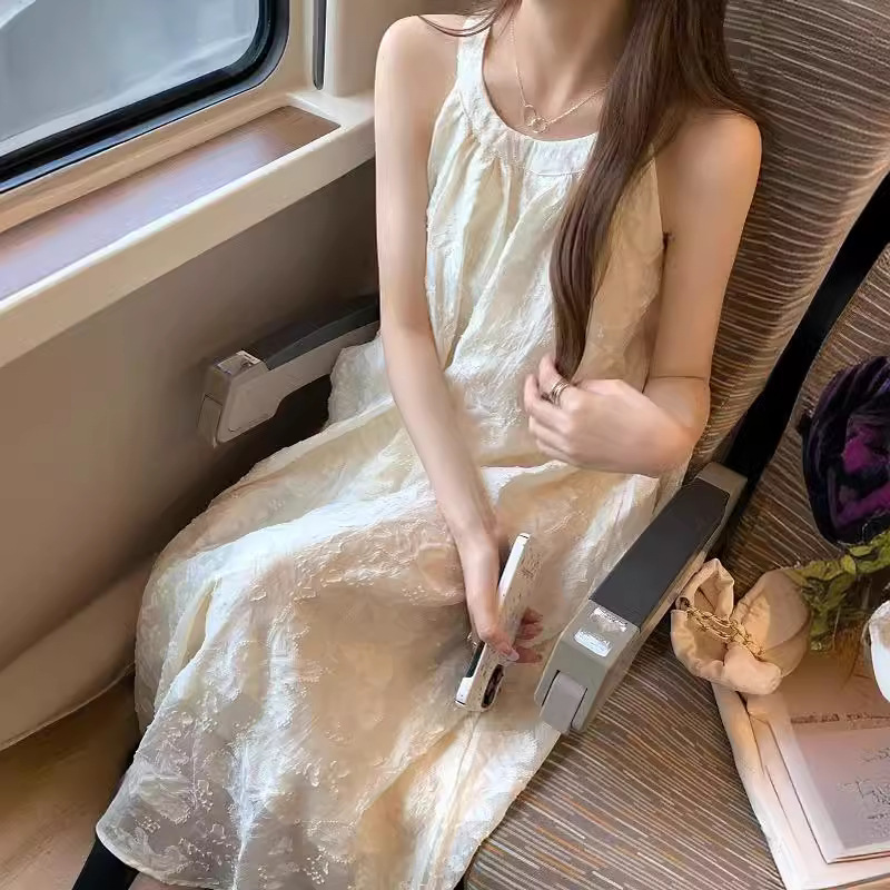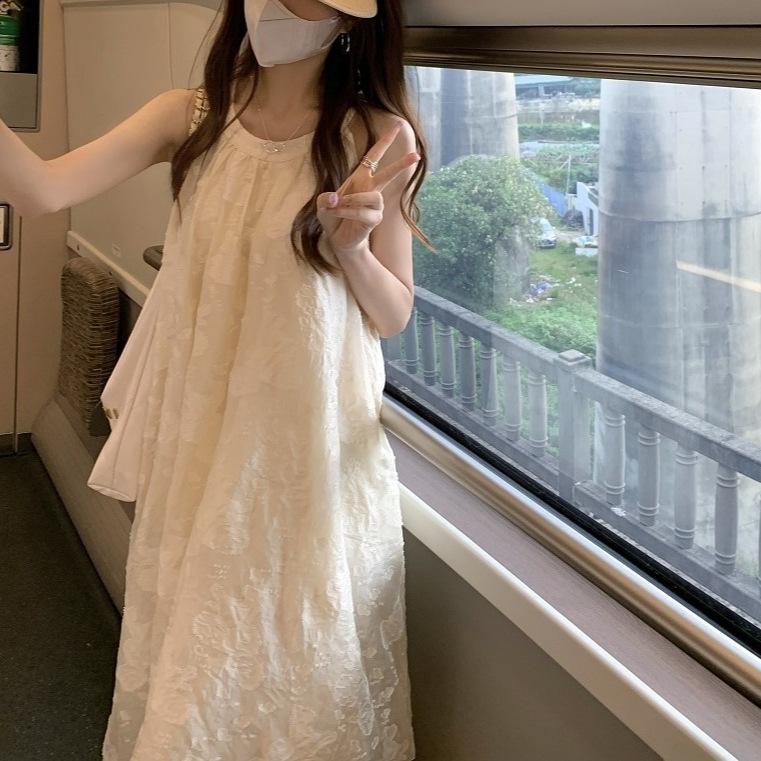 韩版无袖连衣裙女夏新款温柔度假风减龄长款蕾丝钩花背心裙子