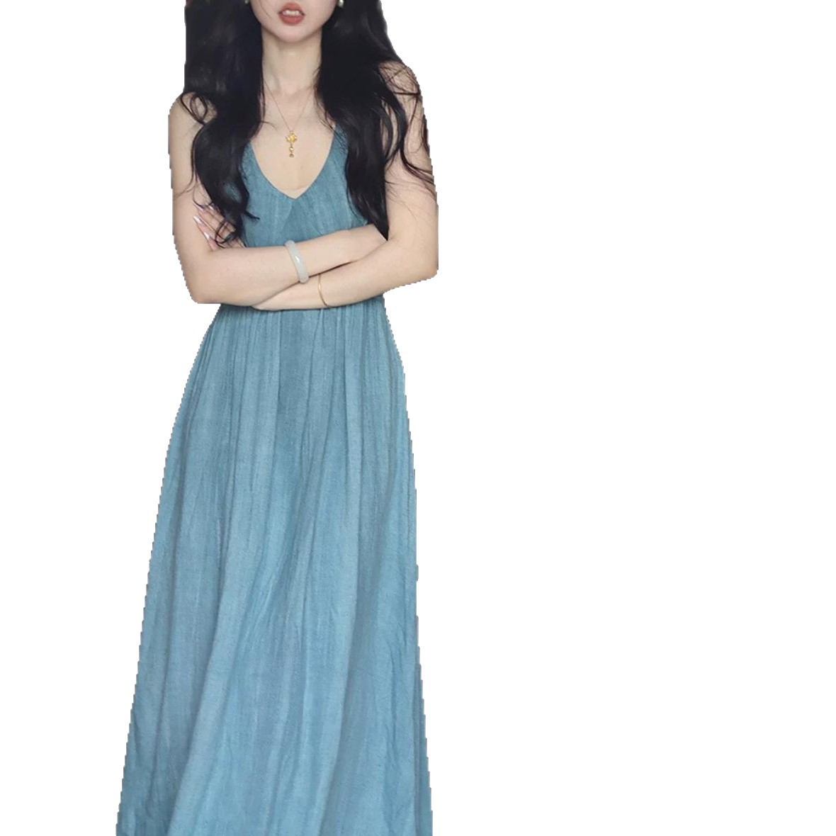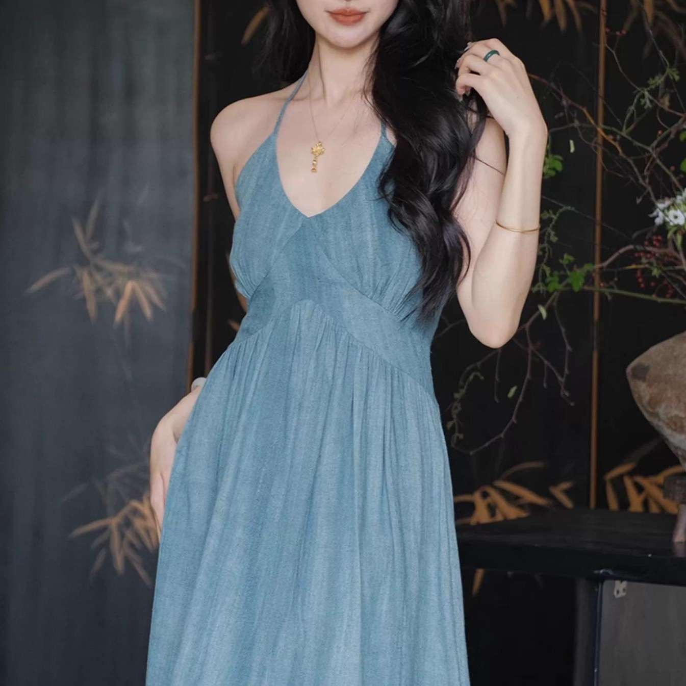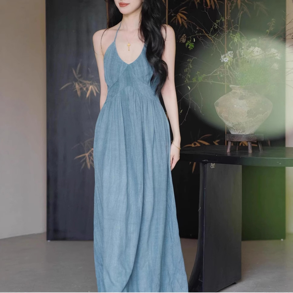 贰羊设计【天青雨】炒色亚麻国风新中式挂脖吊带连衣裙女夏新款