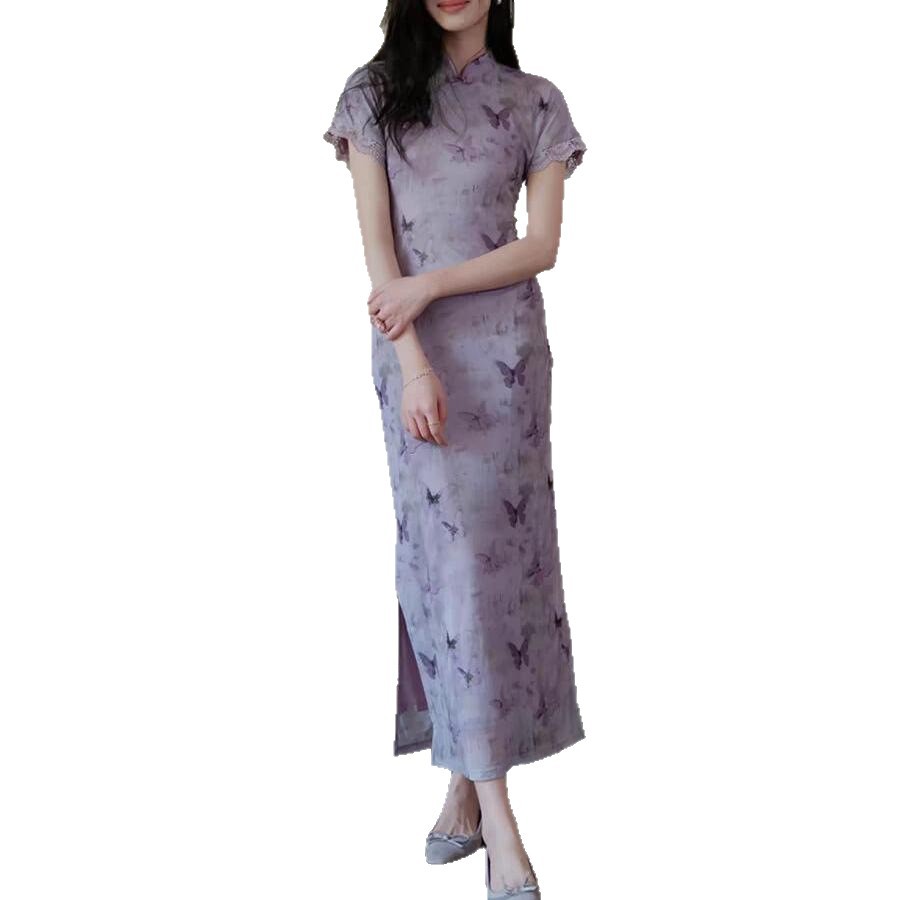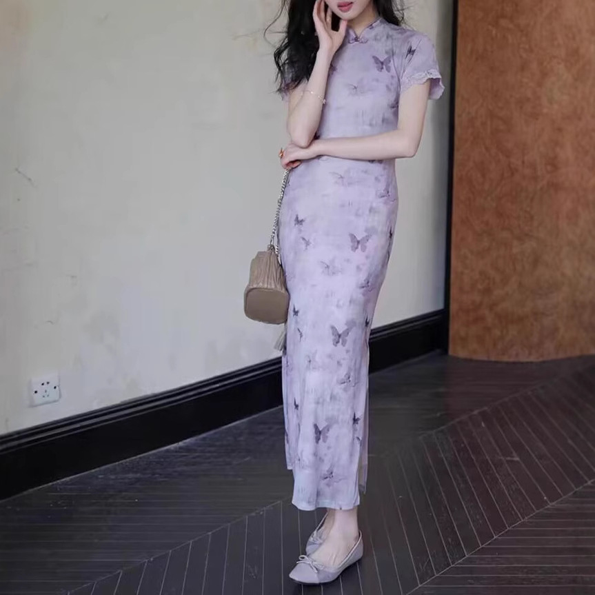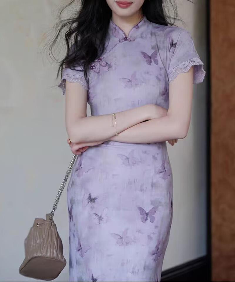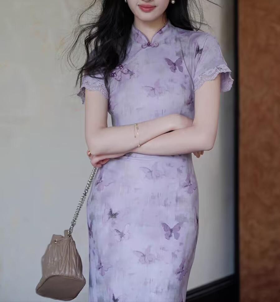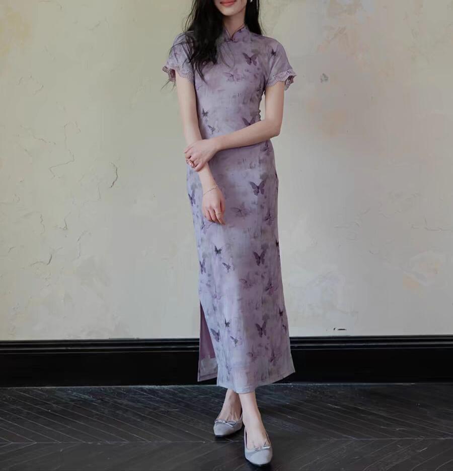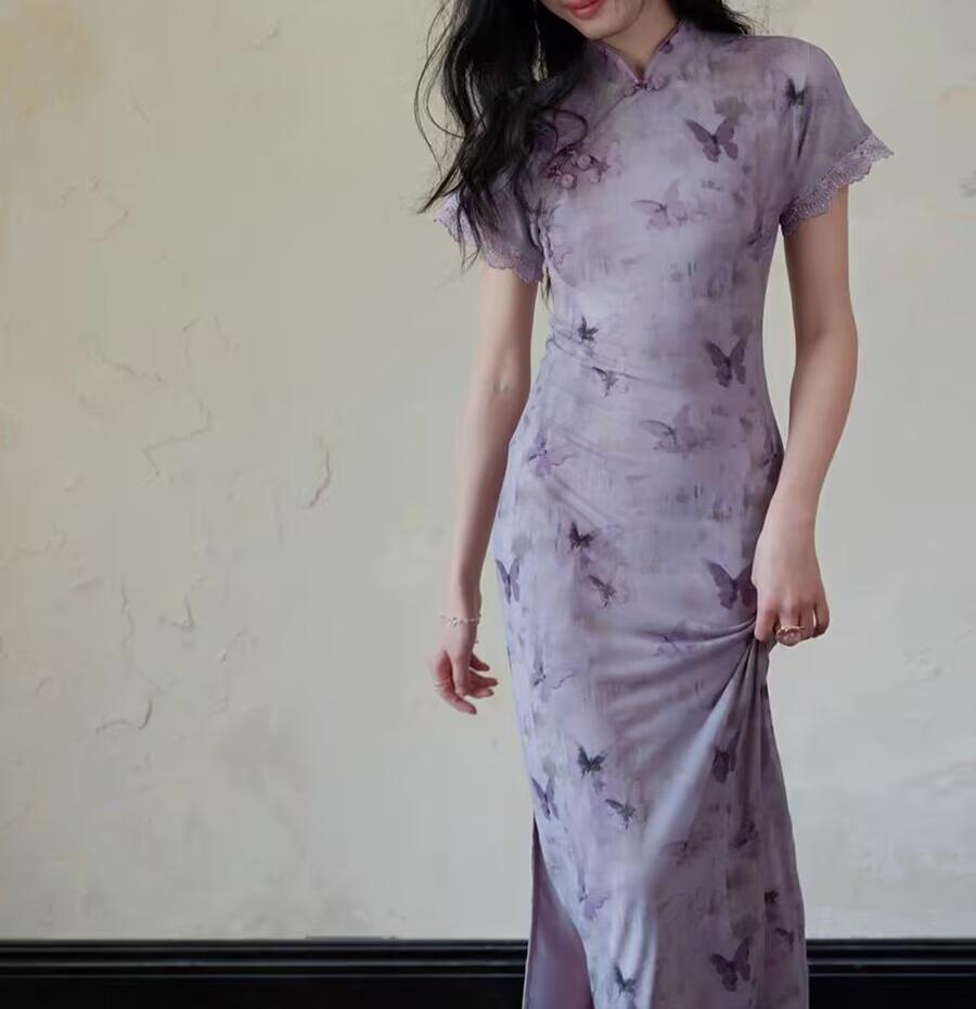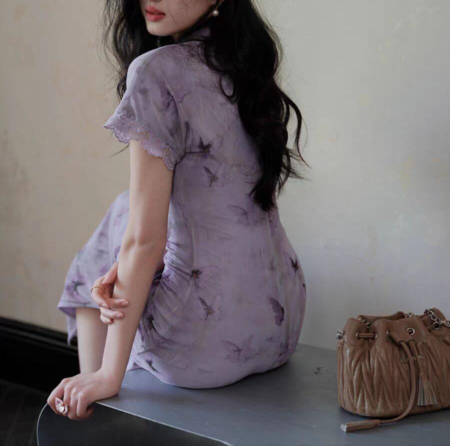 TYANG贰羊设计梦蝶国风新中式紫色蝴蝶旗袍连衣裙