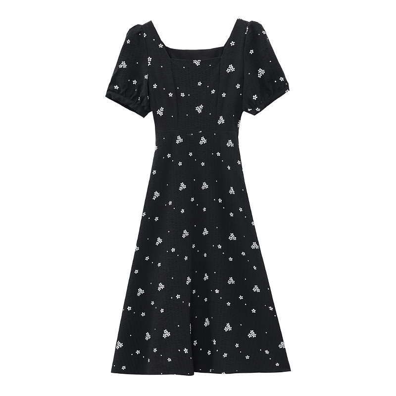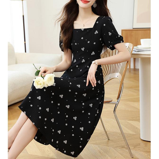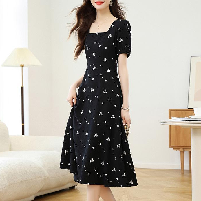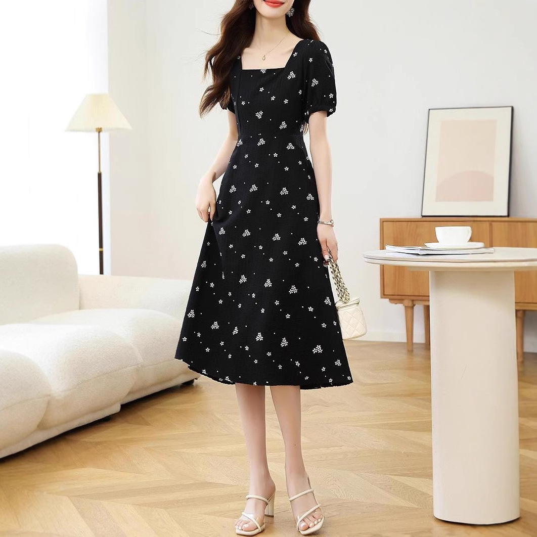 黑色赫本风碎花连衣裙女夏季新款法式收腰显瘦方领雪纺a字裙子