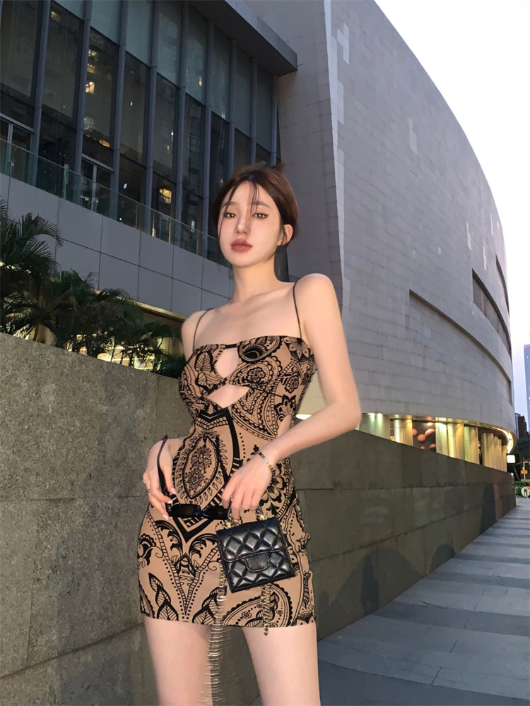 新款欧美印染连衣裙女美式海边度假夏季设计感短裙辣妹包臀裙裙子