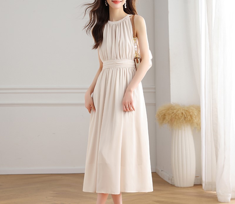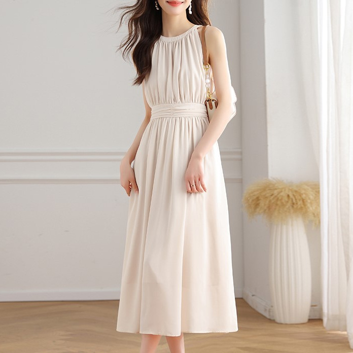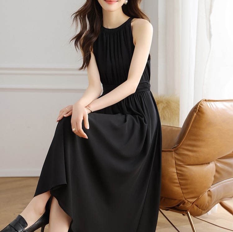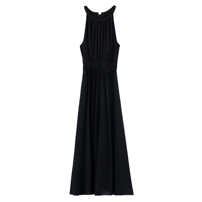 黑色雪纺挂脖连衣裙女夏季法式温柔气质小个子长款A字裙
