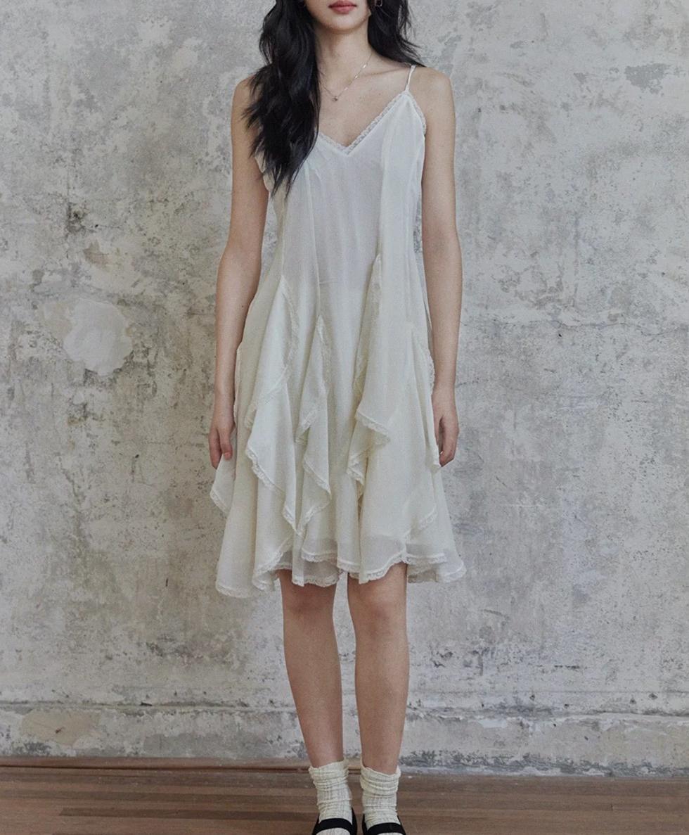 贰羊设计【夕晴】超仙垂感不规则雪纺蕾丝v领吊带连衣裙女夏新款
