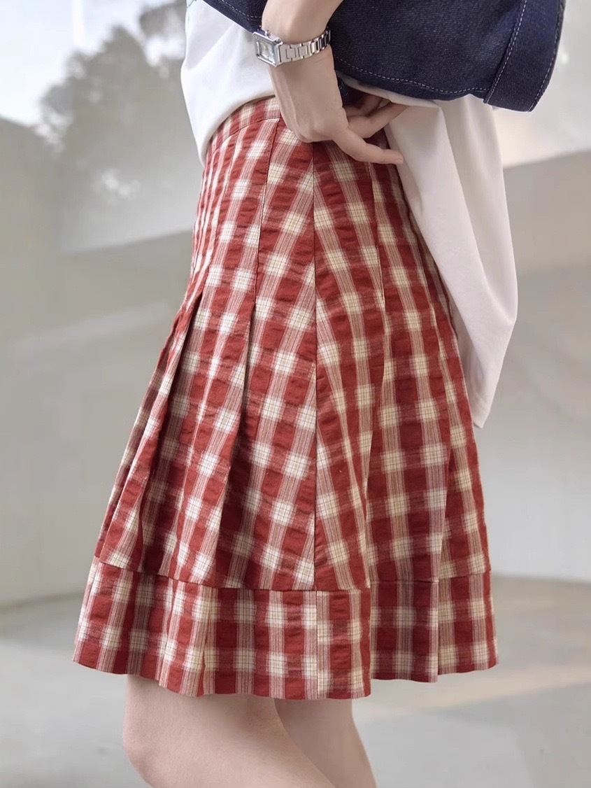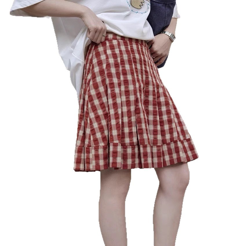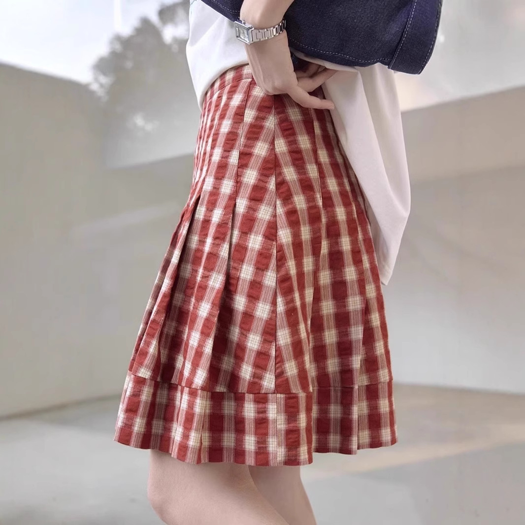 1313复古吸晴红色格纹压褶显瘦半身裙女夏显白显瘦百褶裙肌理短裙