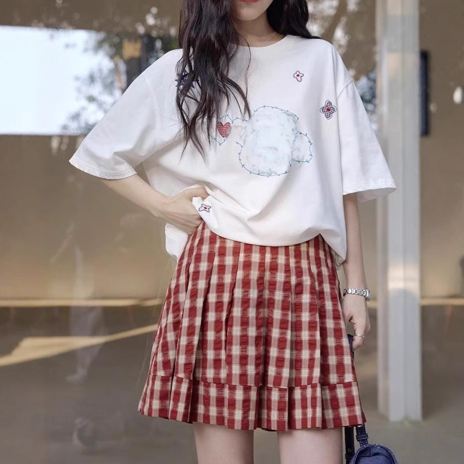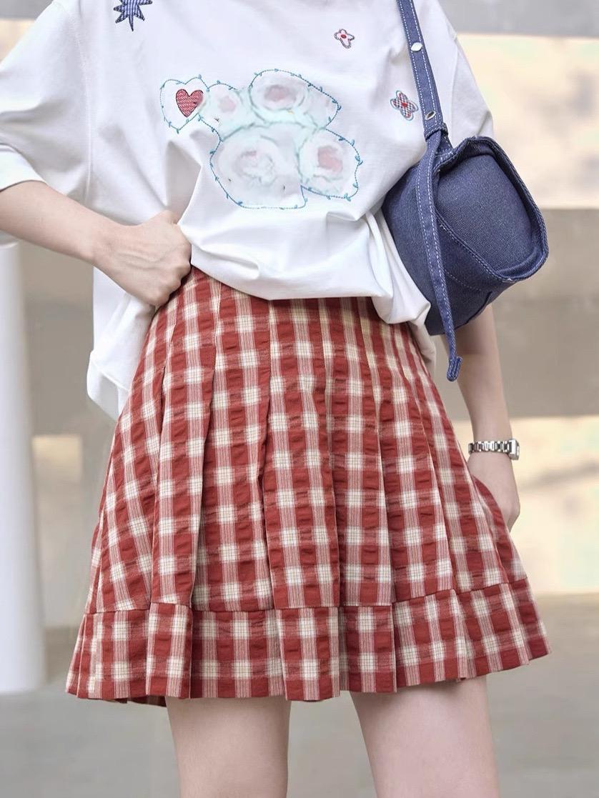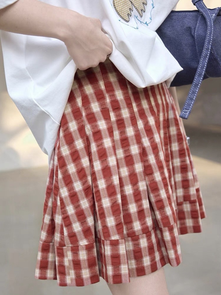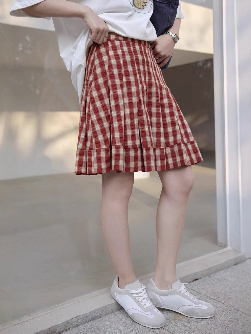 1313复古吸晴红色格纹压褶显瘦半身裙女夏显白显瘦百褶裙肌理短裙