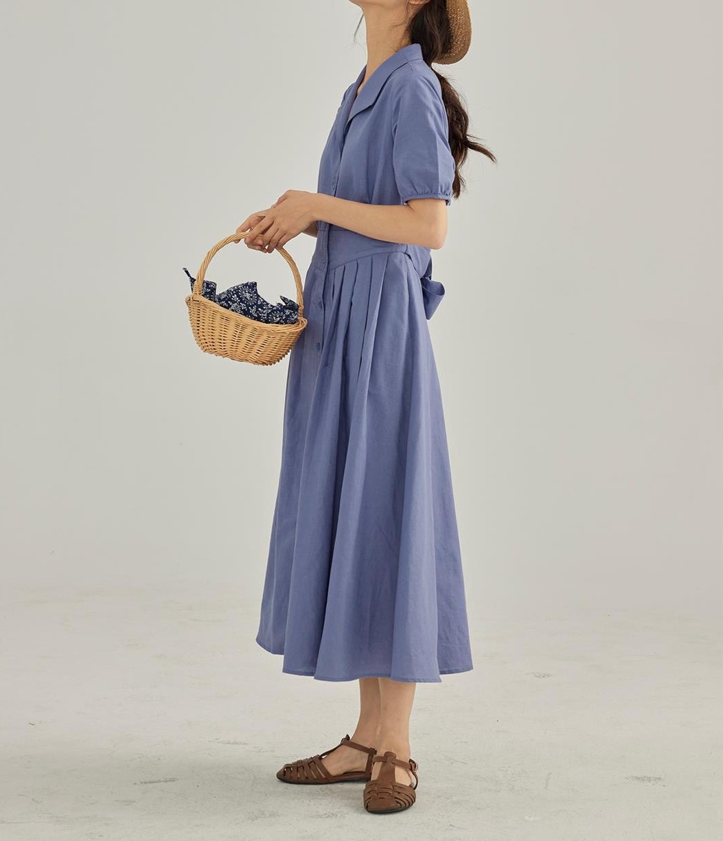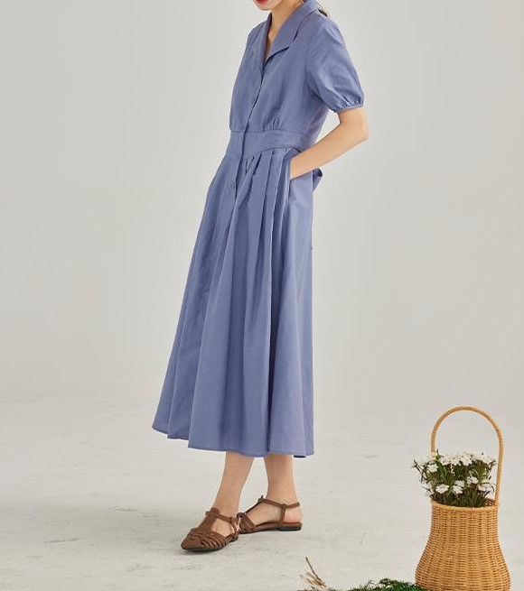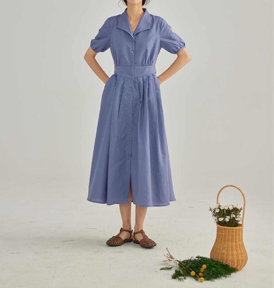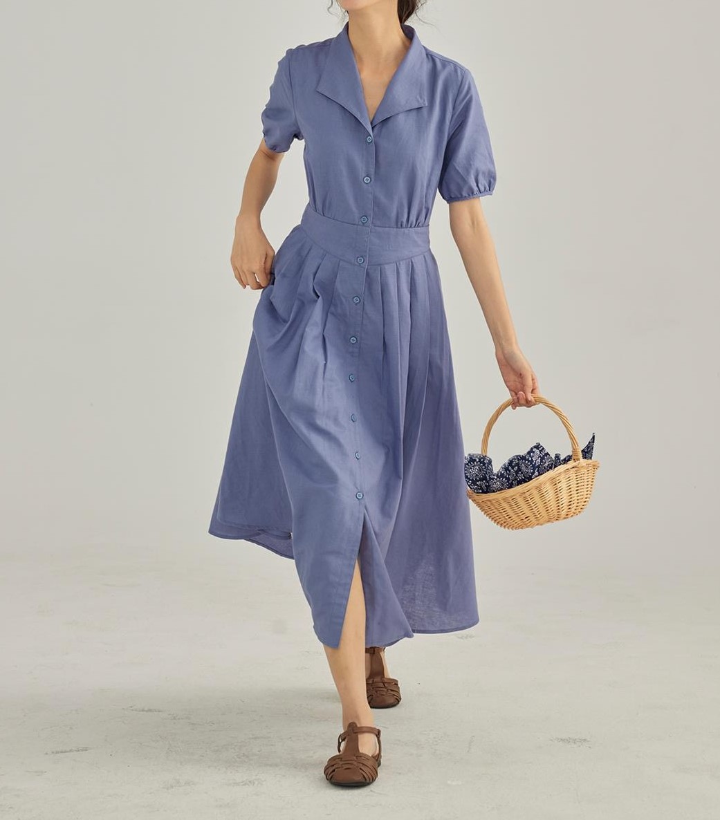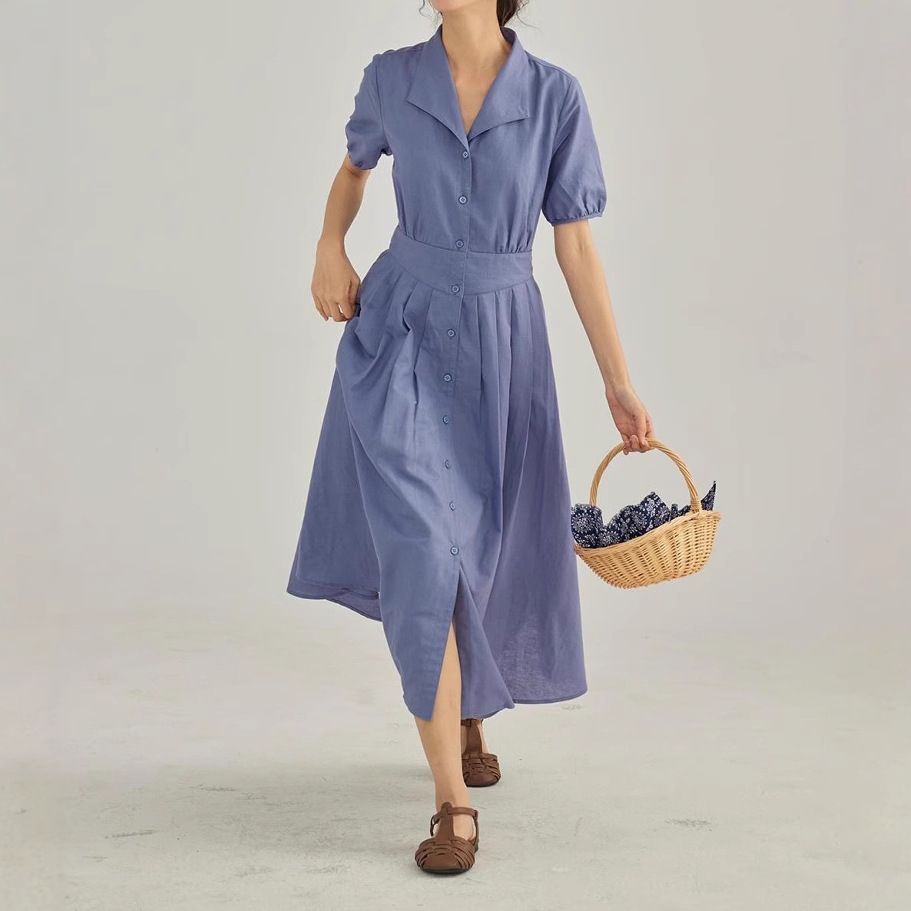 Sulenger 桔梗蓝短袖连衣裙女挺阔感棉麻混纺亲肤收腰压褶长裙女