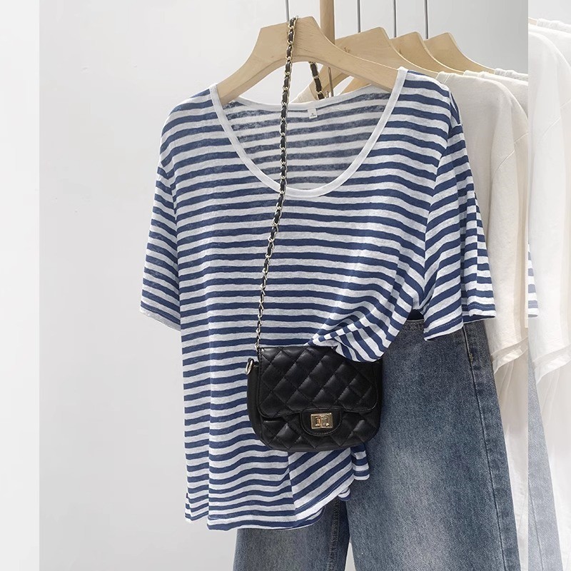 薄款条纹t恤女宽松百搭撞色上衣夏季设计感U领漏锁骨短袖