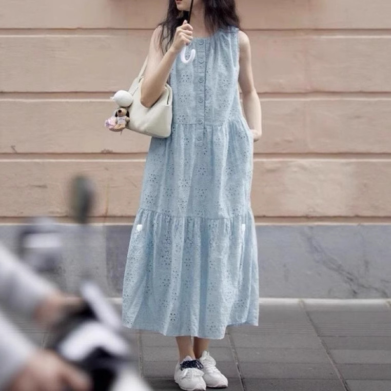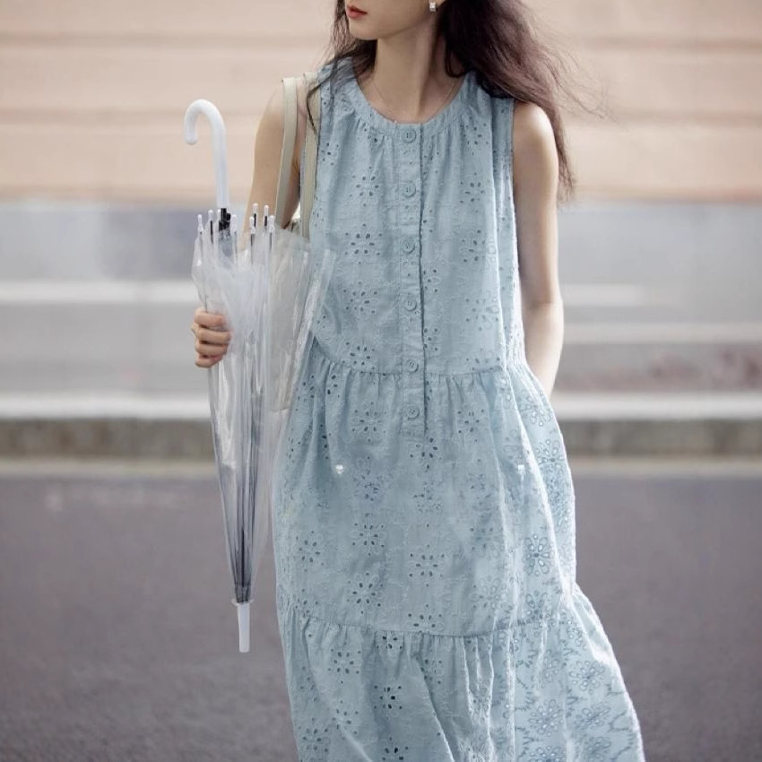 1313温柔文艺天丝钩花镂空蓝背心裙25夏季女度假长裙宽松连衣裙