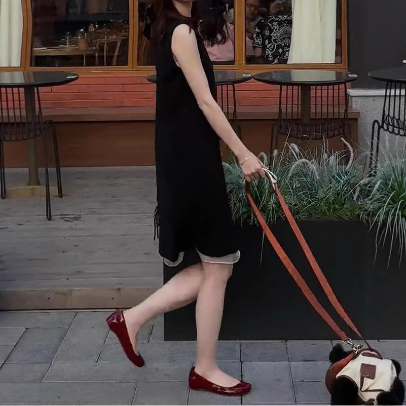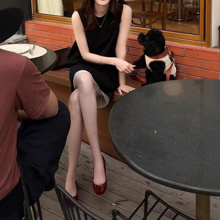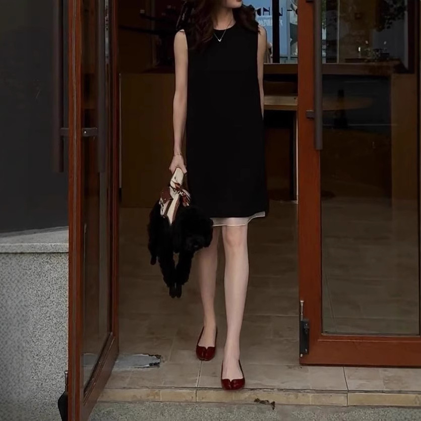 赫本风气质网纱拼接黑色连衣裙女夏新款小个子法式无袖减龄背心裙