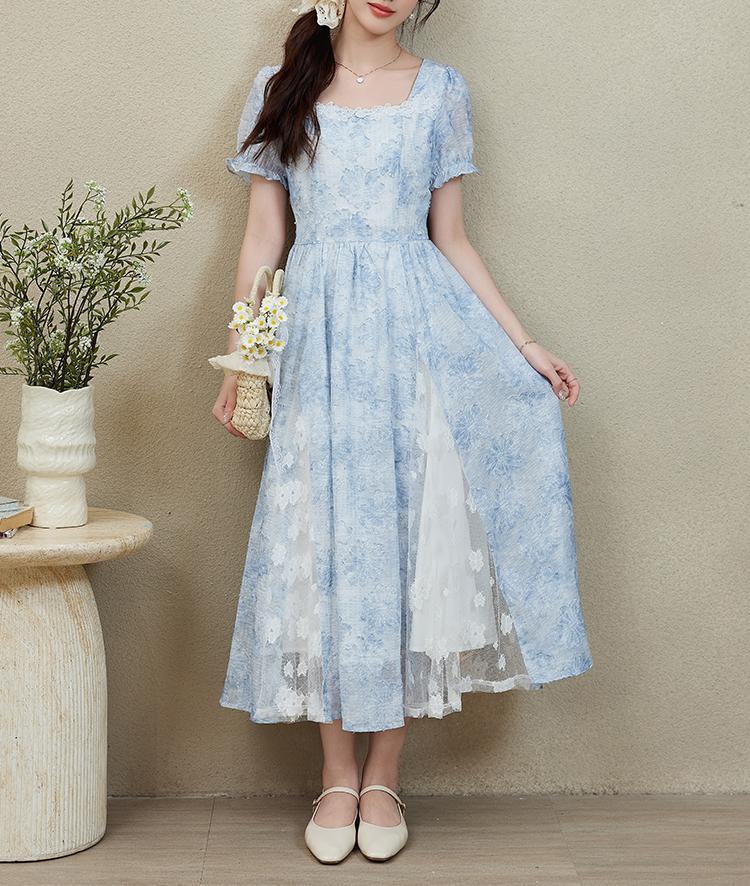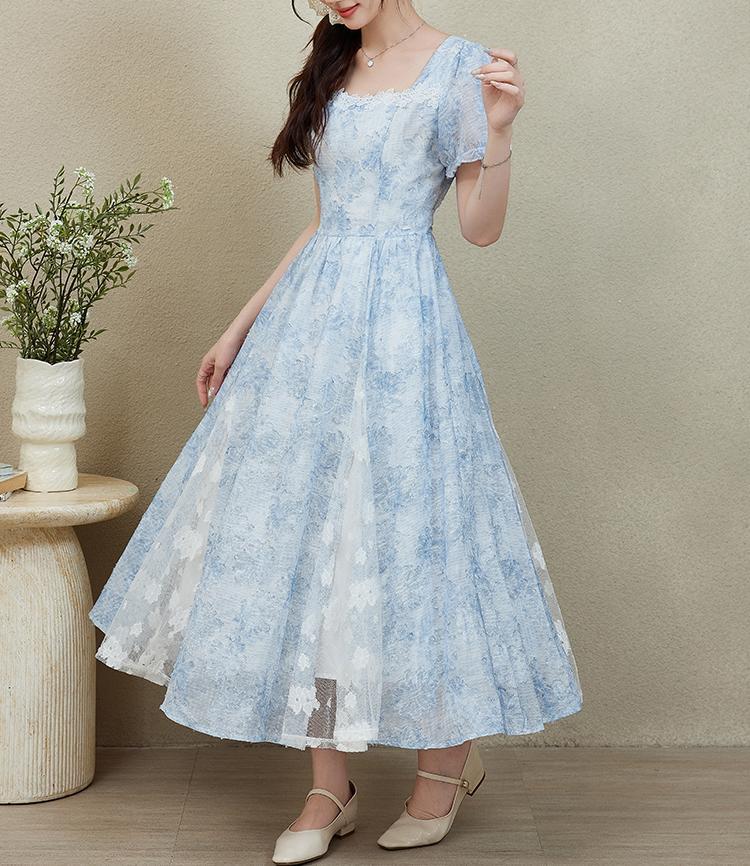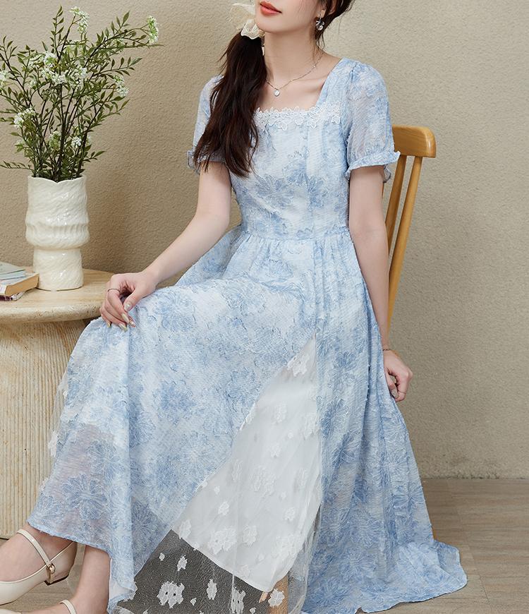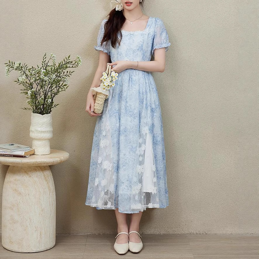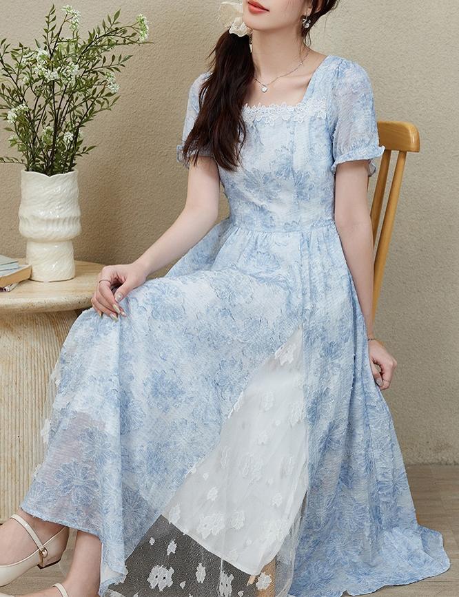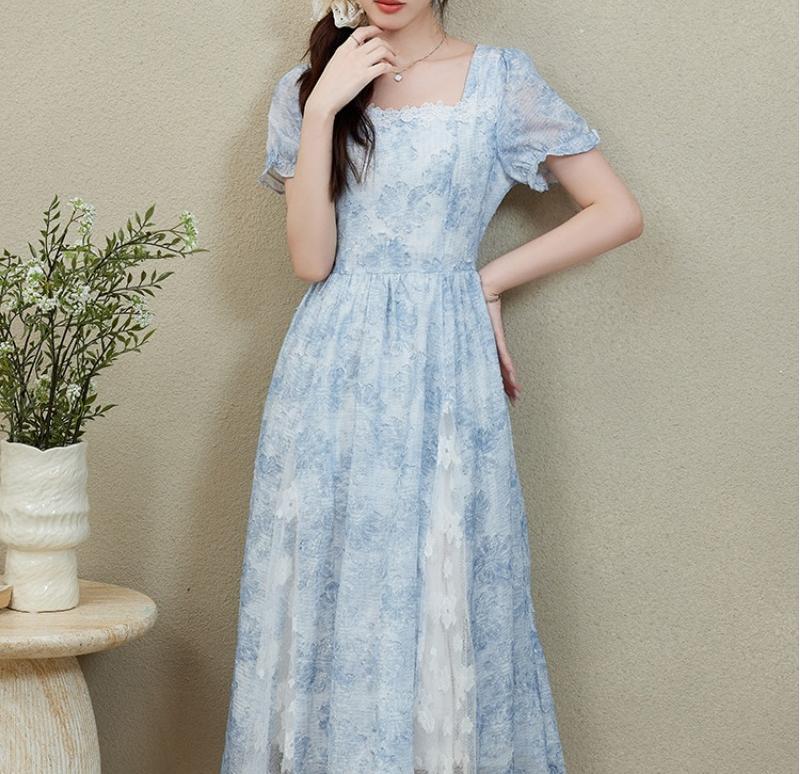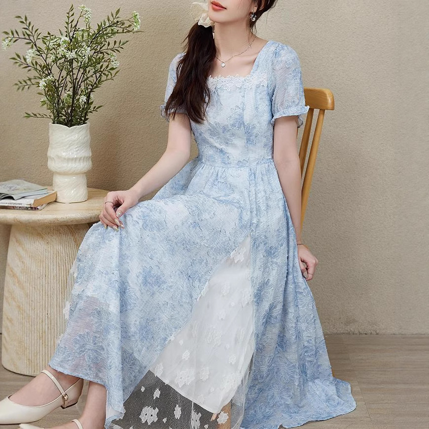 法式气质蓝色花朵短袖方领连衣裙女夏风收腰长裙2025夏季新款