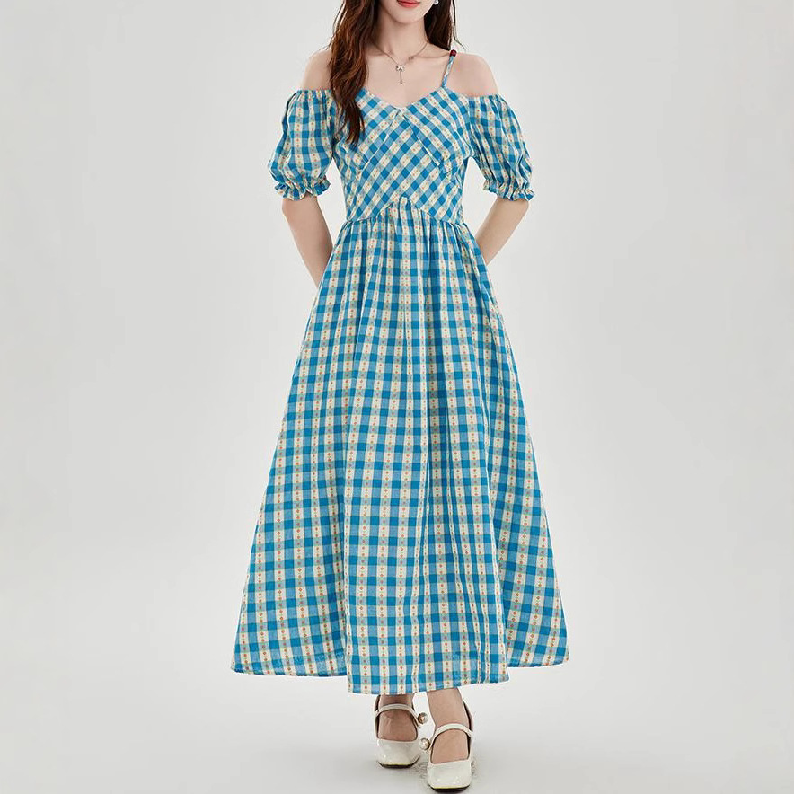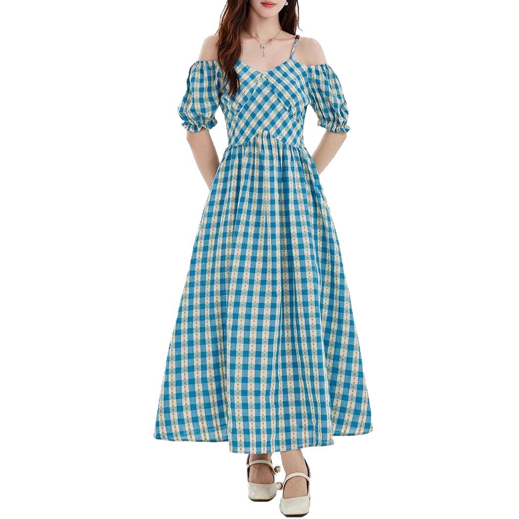绝美裙子法式复古蓝色格纹连衣裙女夏高级感收腰显瘦泡泡袖长裙子