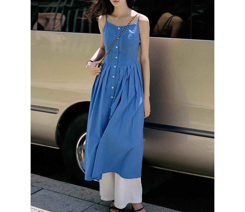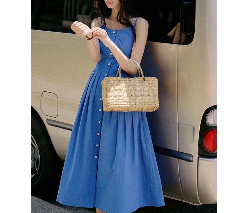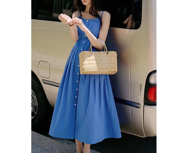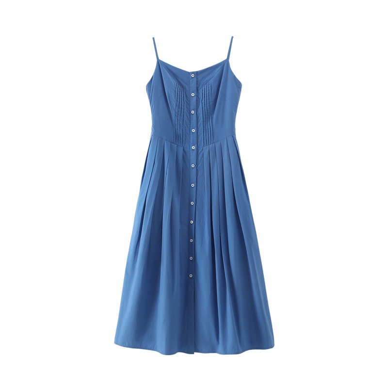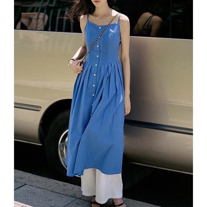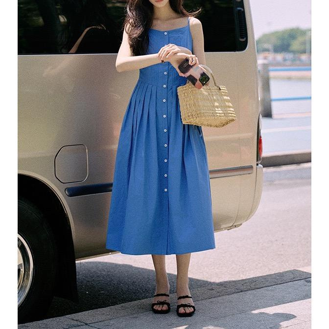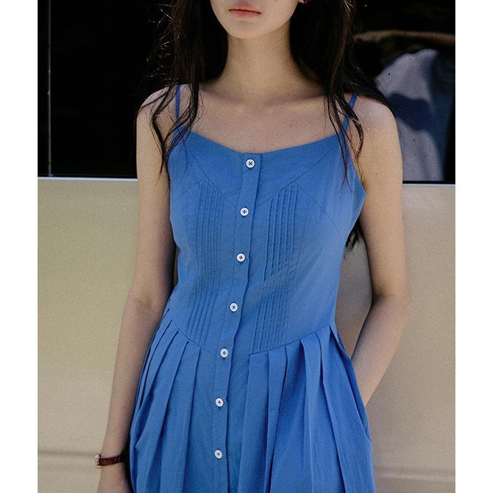 克莱因蓝色吊带连衣裙女夏季新款单排扣显瘦小众设计感裙子