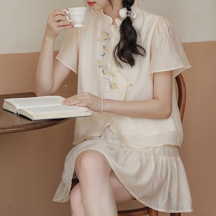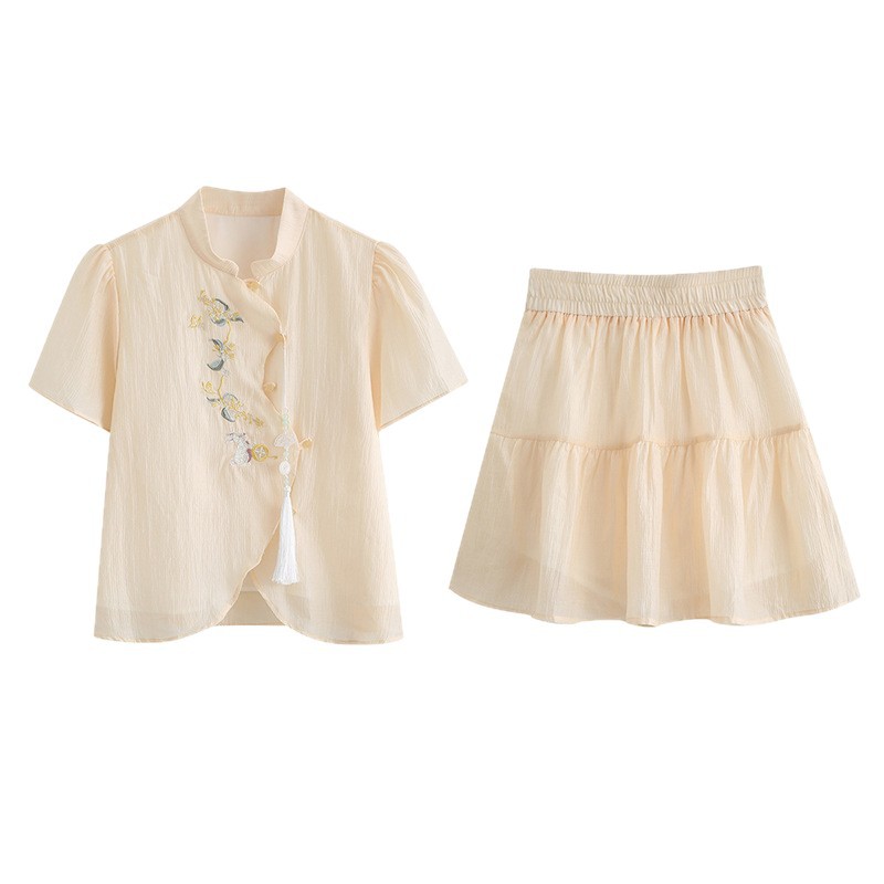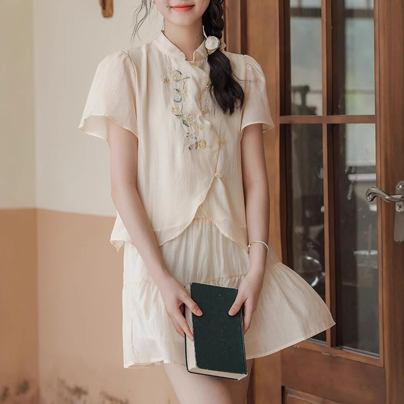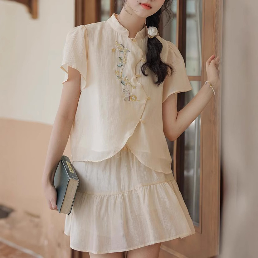 人手一件~绣花新中式国风盘扣套装女小个子夏季衬衫短裙甜美a字裙