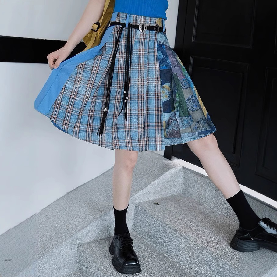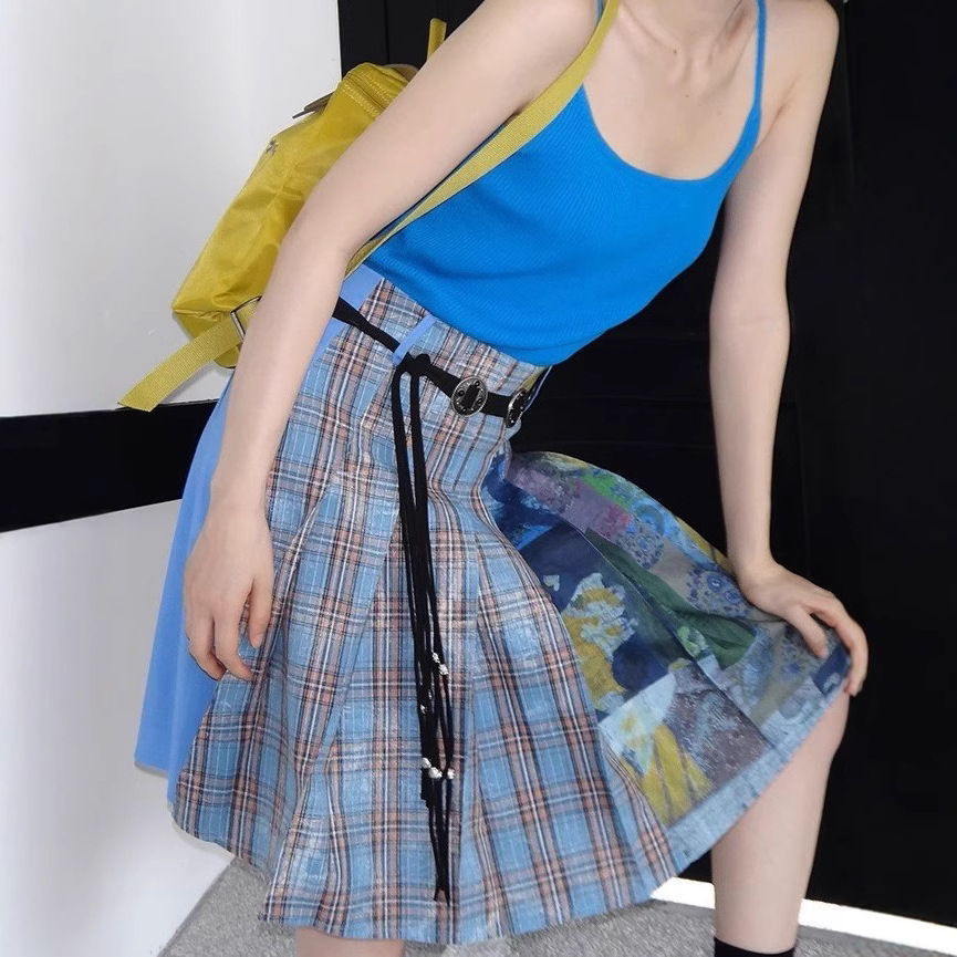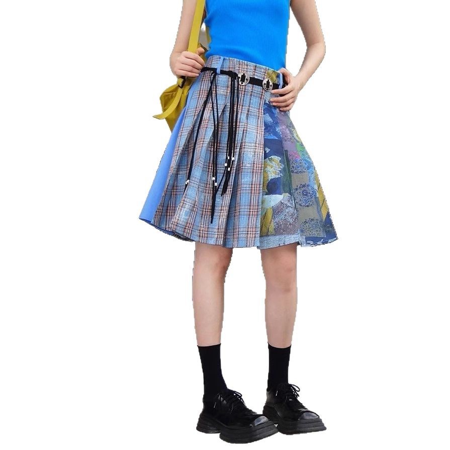 「克罗地亚海风」棉质复古印花格纹压褶半身裙女夏季气质新款