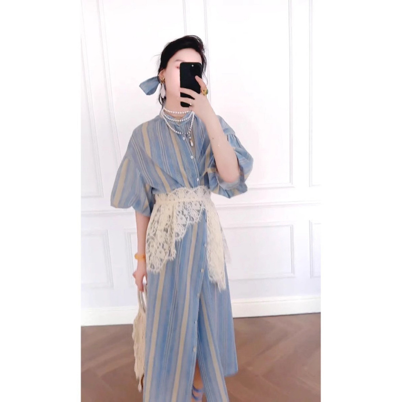 高档感蓝色条纹衬衫裙套装女春秋轻奢复古长裙蕾丝束腰两件套