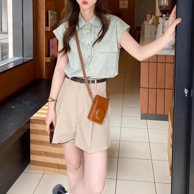 绿色尖领短袖衬衫女夏小众设计气质百搭休闲宽松上衣