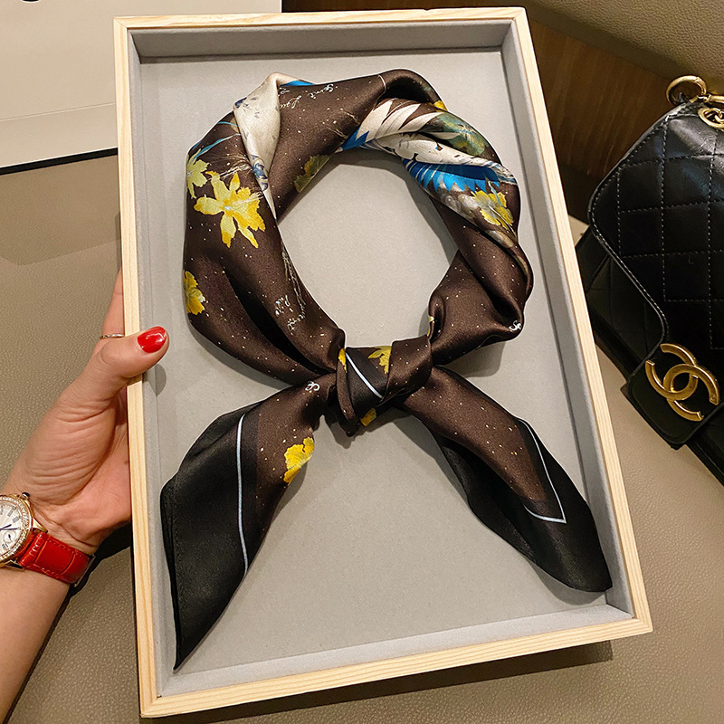 新款黑咖色丝巾女花卉图案68cm时尚真丝方巾100%桑蚕丝围巾