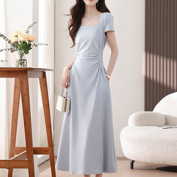 法式度假风气质高级连衣裙女夏季新款休闲收腰泡泡袖方领长裙