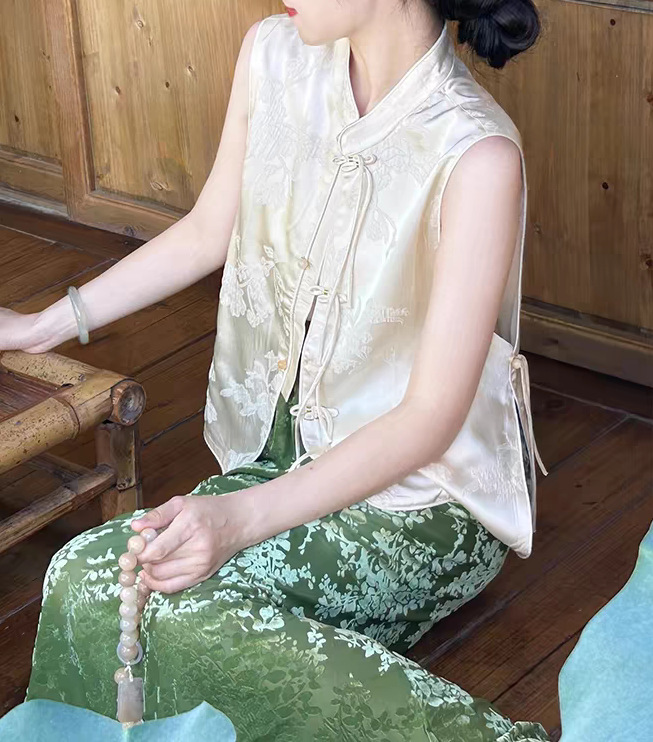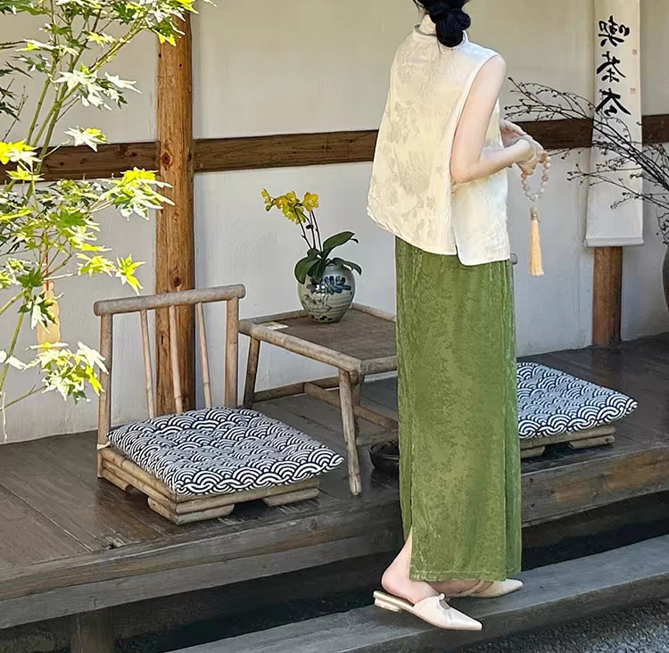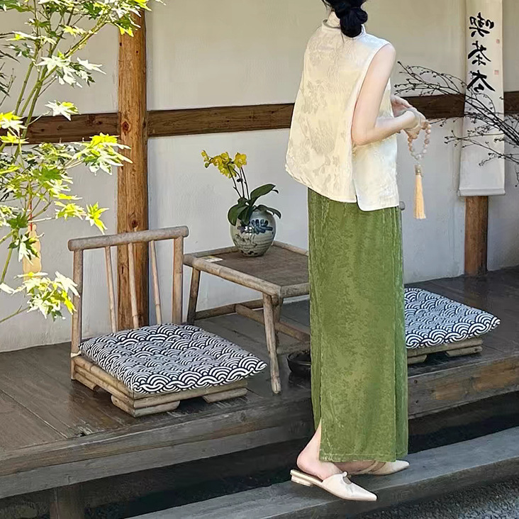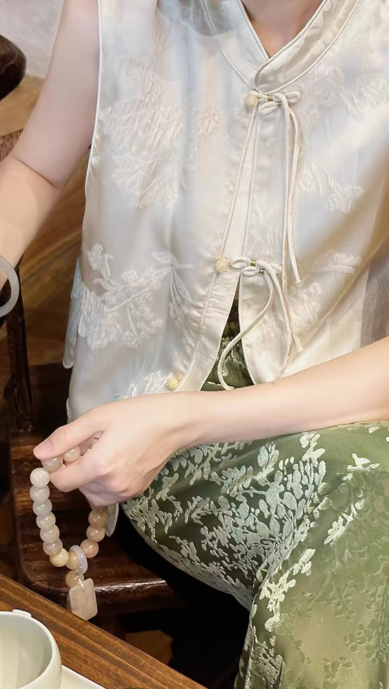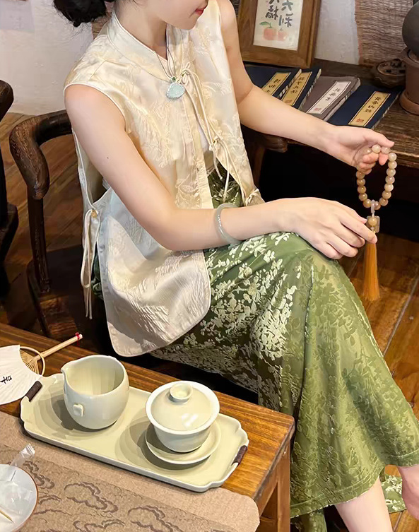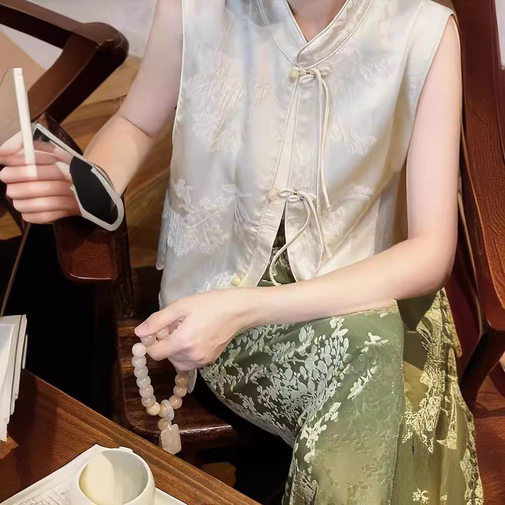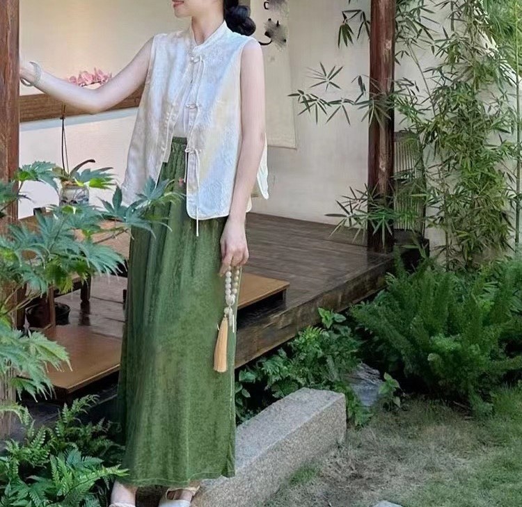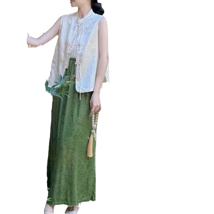 新中式女轻国风上衣盘扣马甲绿色半身裙夏季气质小众两件套