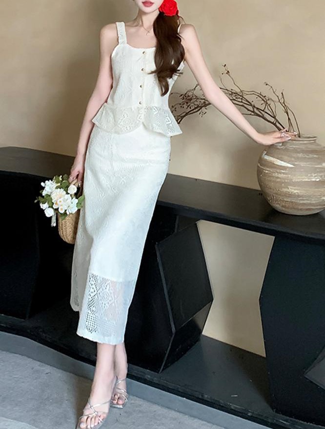女夏新款复古蕾丝吊带荷叶边上衣气质包臀半身裙