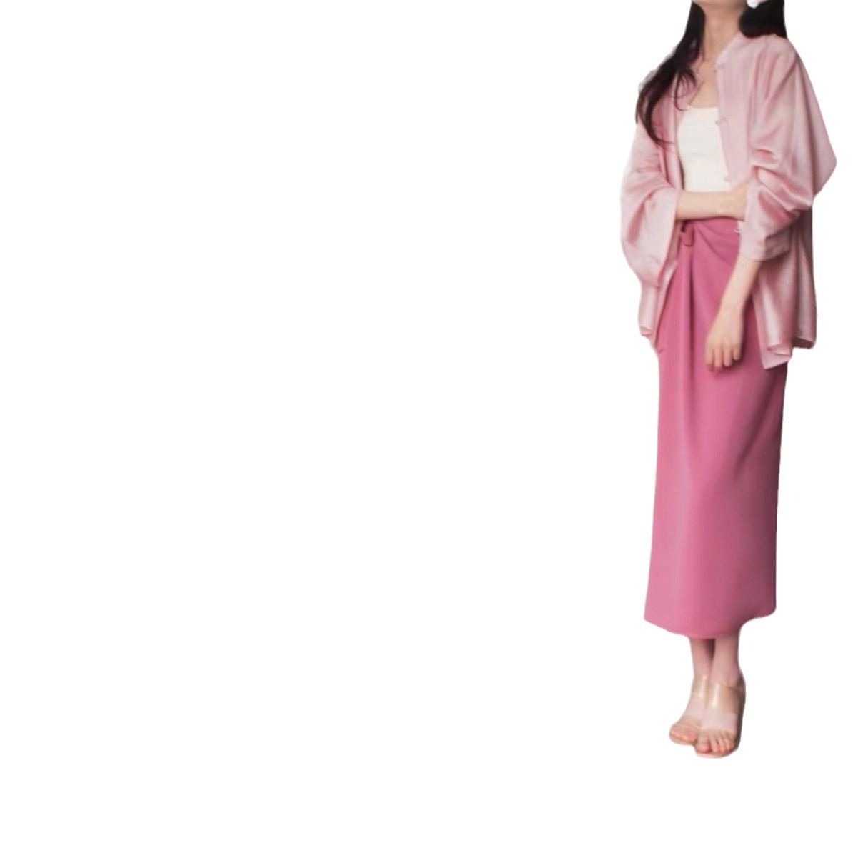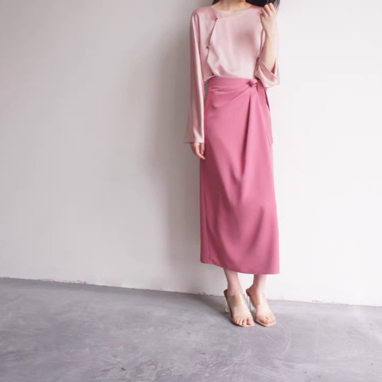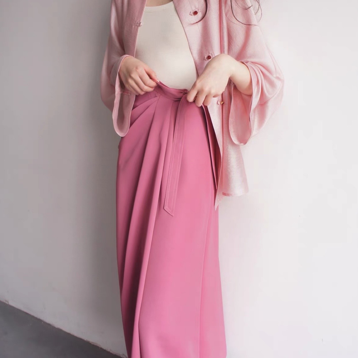 蔷薇粉系带不对称高腰过膝H型设计感收褶浪漫半身裙