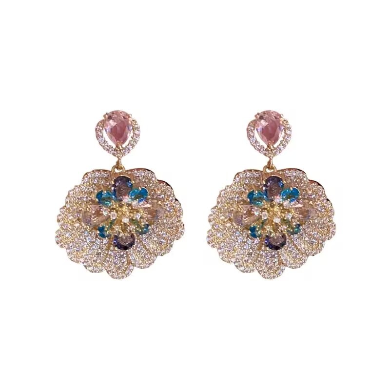 高版本925银+加厚真金电镀 微镶锆石镶钻花朵扇叶耳环波西米亚高