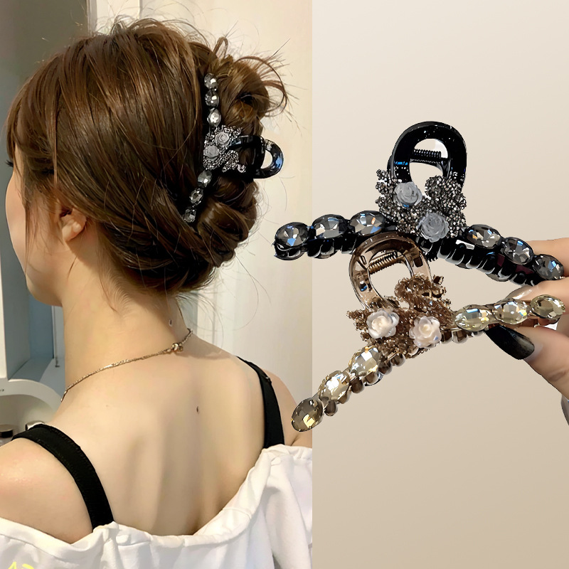闪钻天鹅山茶花抓夹女后脑勺盘发抓大号鲨鱼夹新款发夹头饰