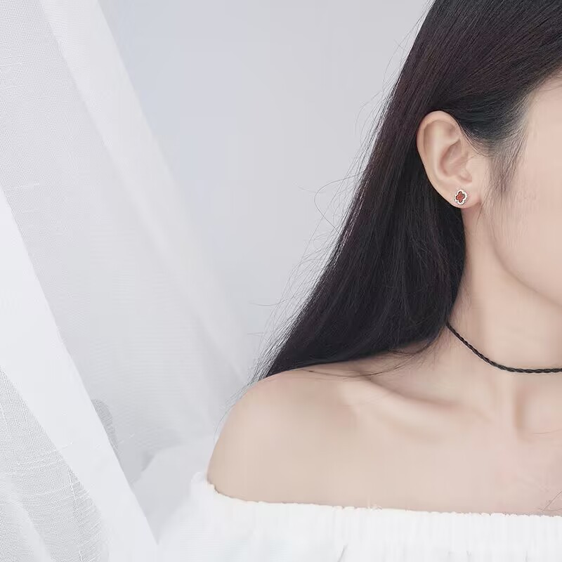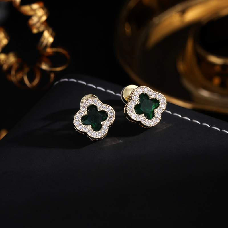S925银针微镶四叶花耳钉女时尚设计高级感绿色锆石耳饰小香风轻奢