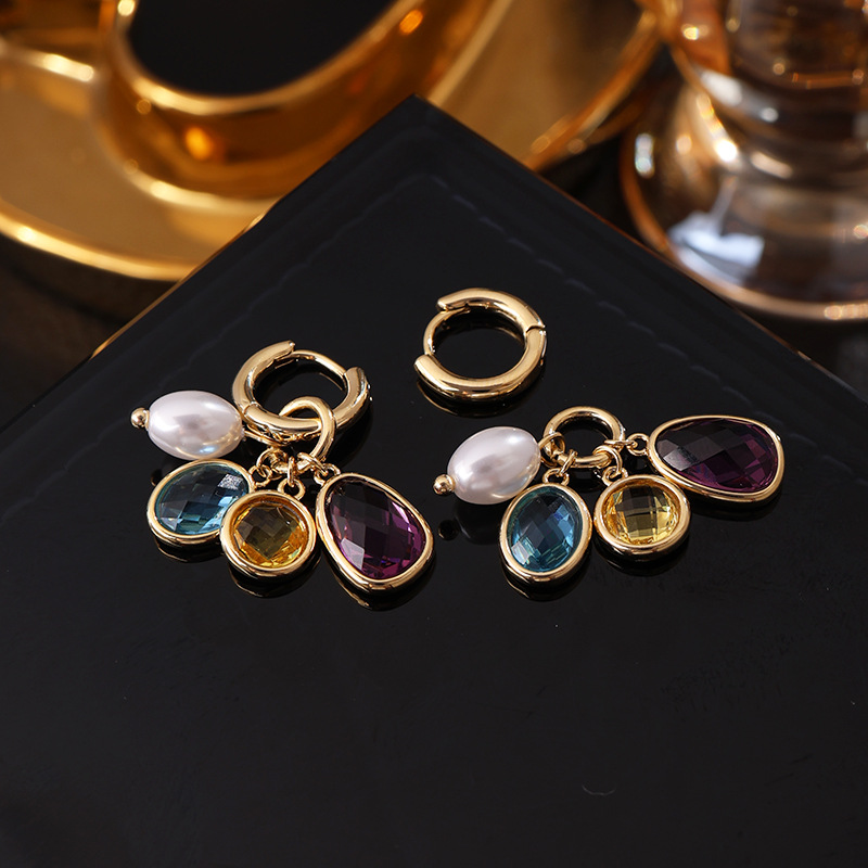 气质时尚法式彩色锆石水晶珍珠圈圈流苏复古高级小众设计耳扣耳饰
