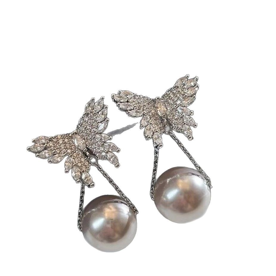 S925银针曼塔玫瑰紫珍珠锆石蝴蝶耳钉轻奢时尚优雅气质高级感耳饰