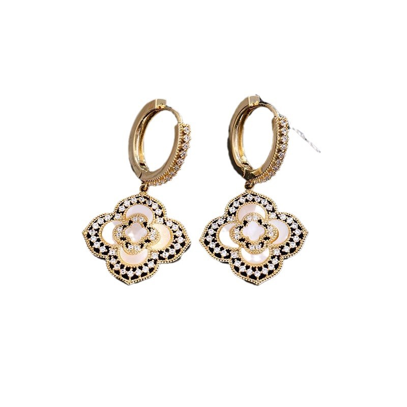 高版本真金电镀 小香风耳坠新款贝母铜镀金锆石镂空四叶草耳环
