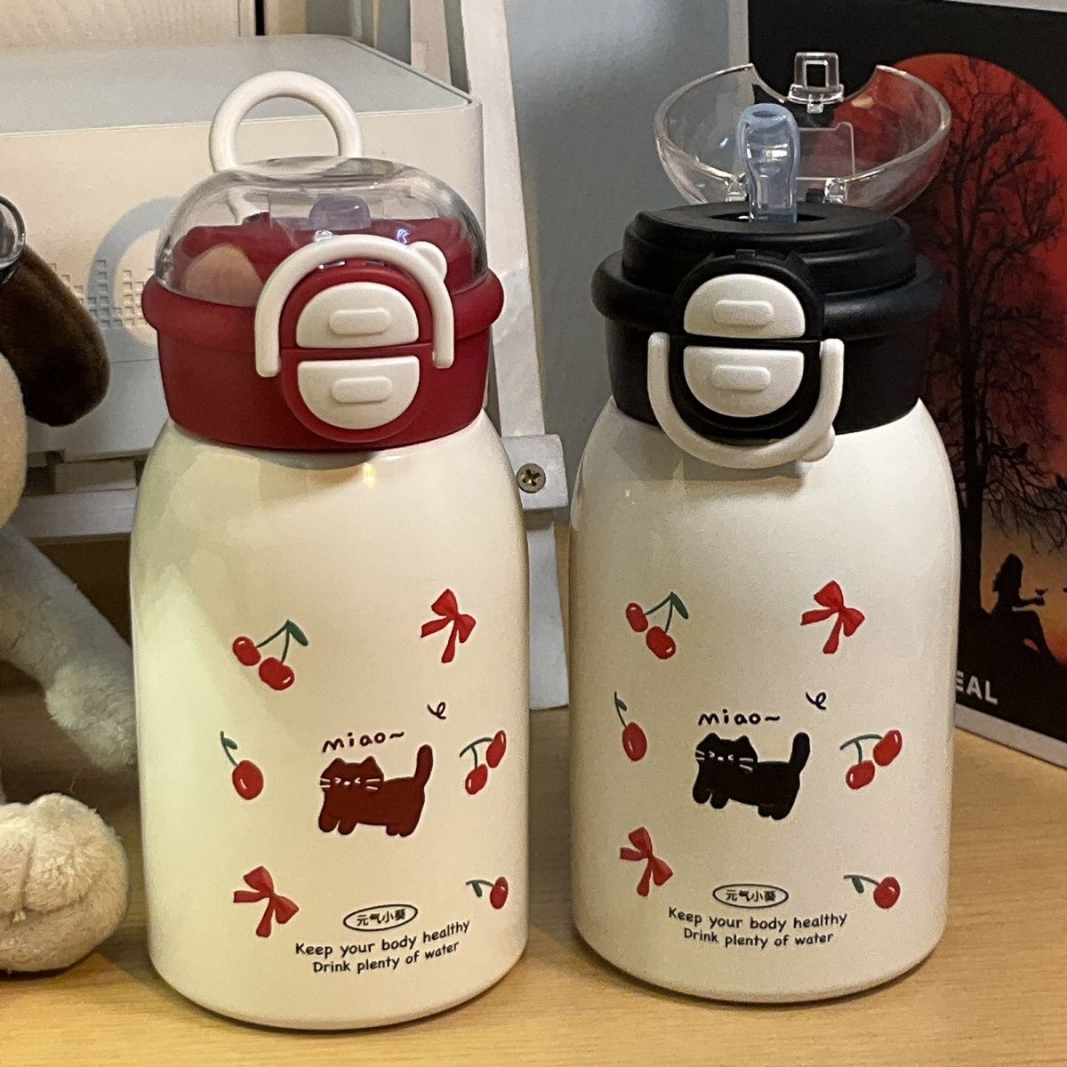 简约小猫新款保温杯子ins高颜值吸管儿童不锈钢便携可爱水杯