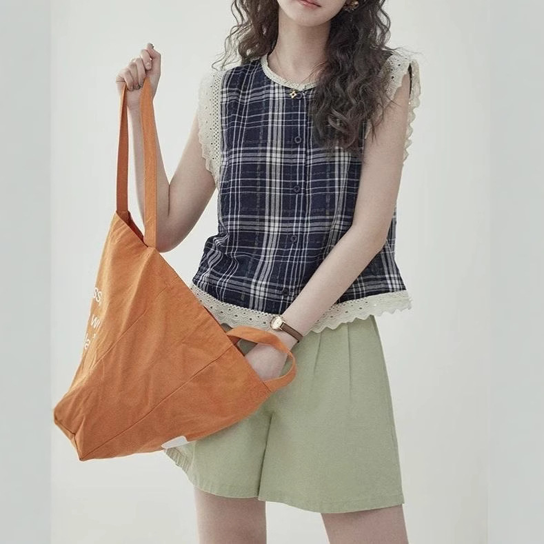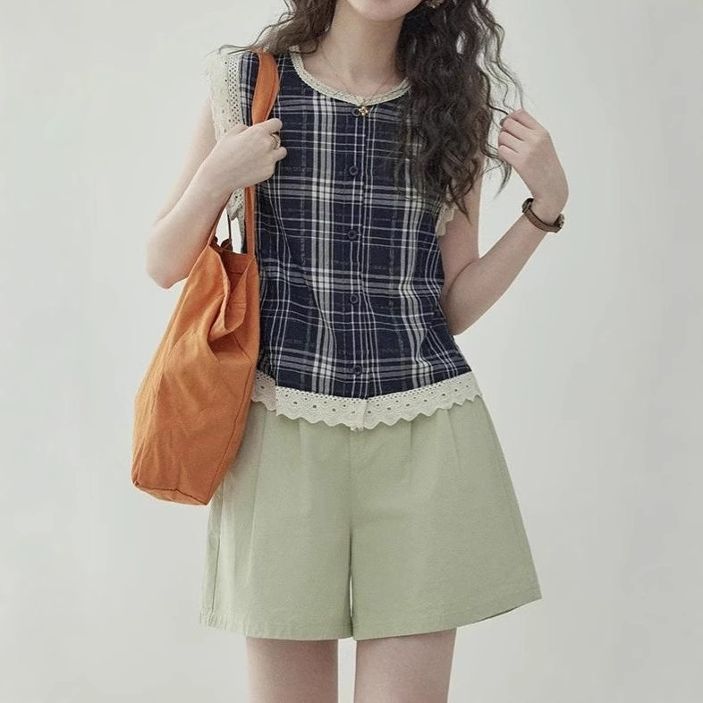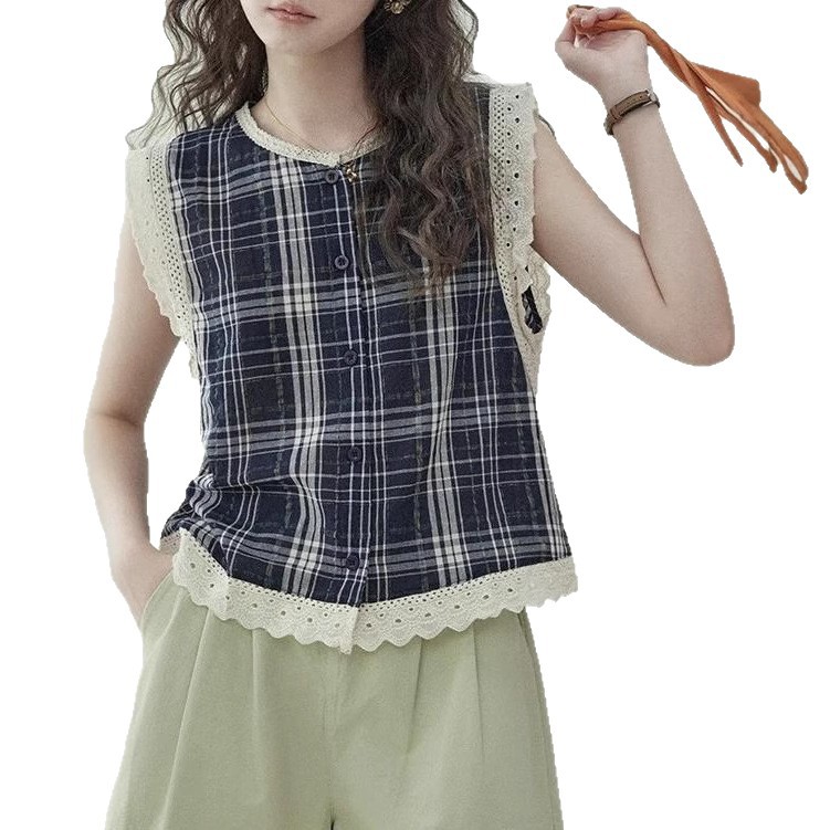 品质推荐~法式蕾丝花边单排扣格子衬衫女夏季新款宽松无袖上衣