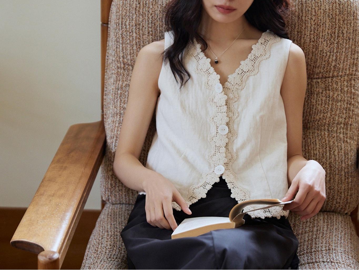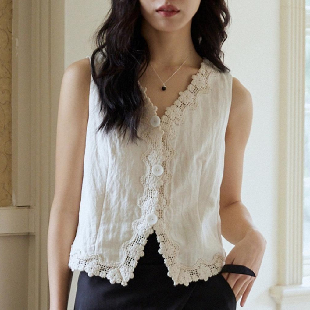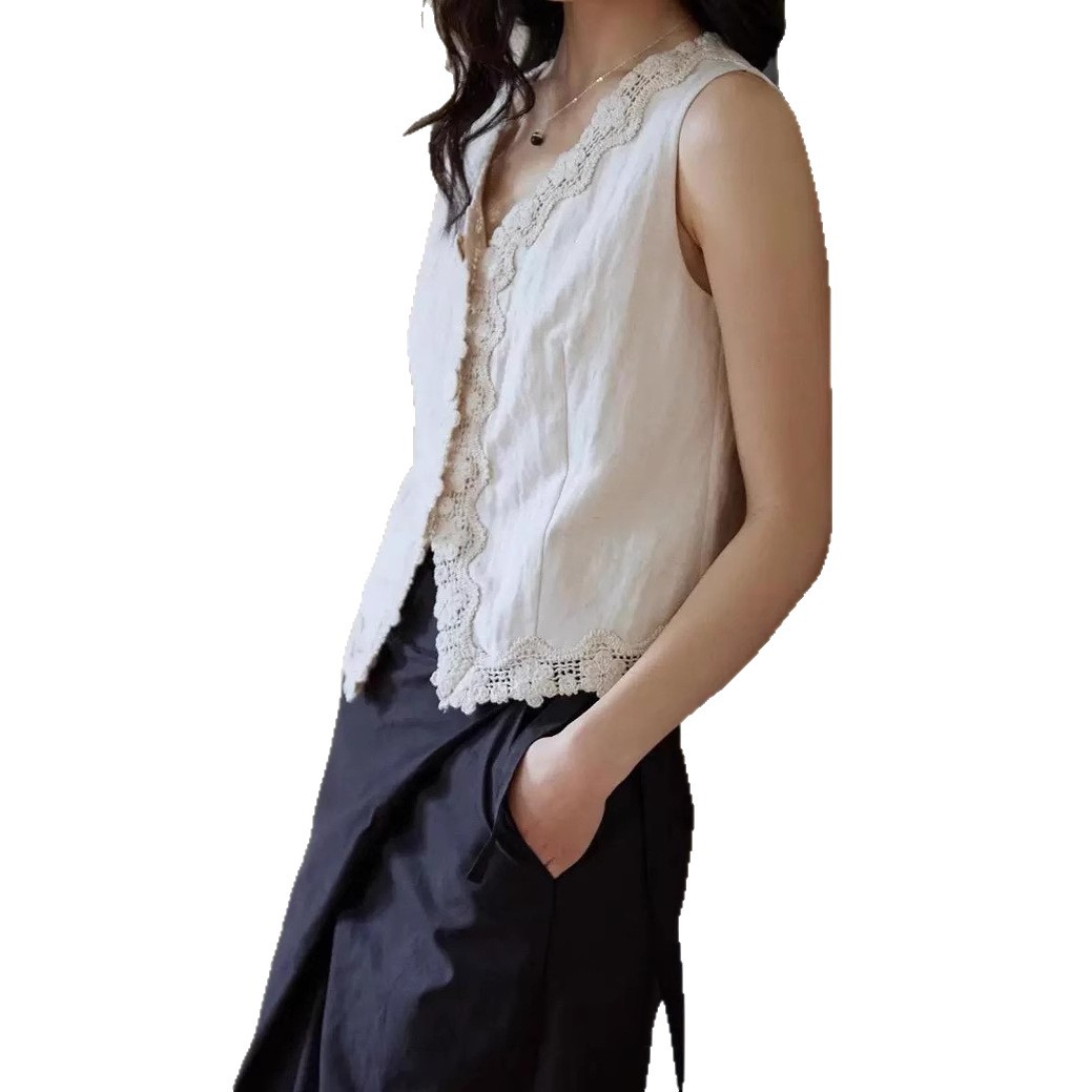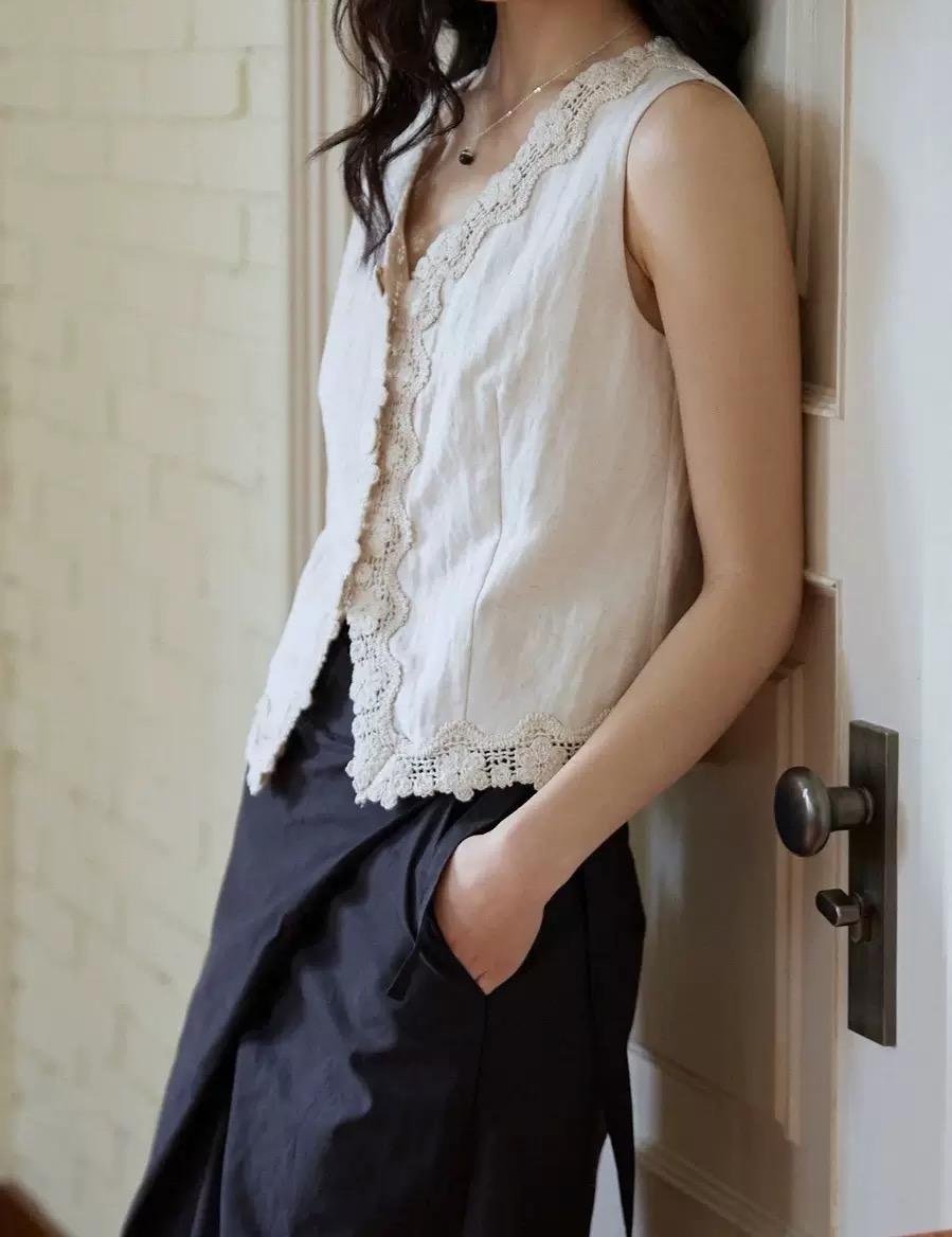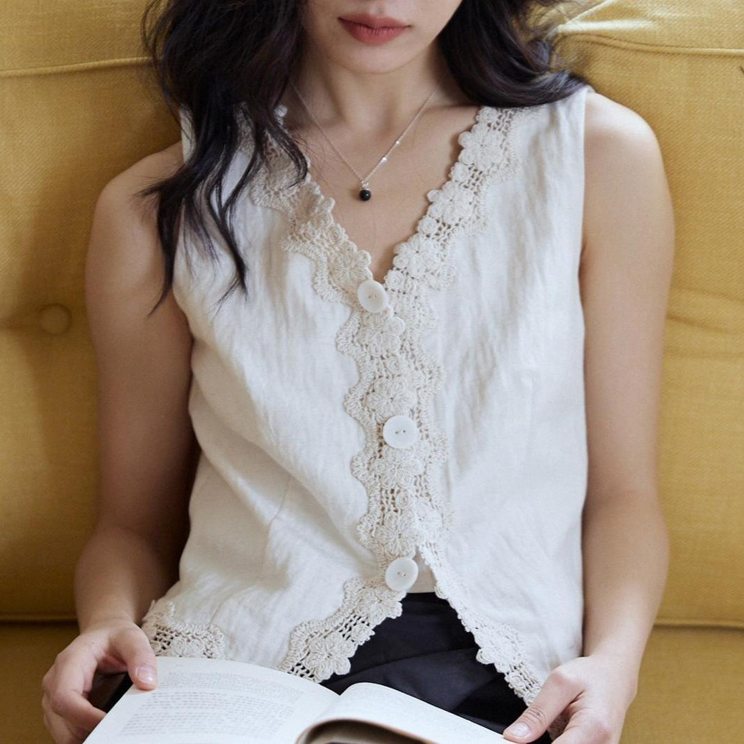 老钱风法式杏色蕾丝花边v领女夏设计感衬衫无袖褶皱肌理上衣