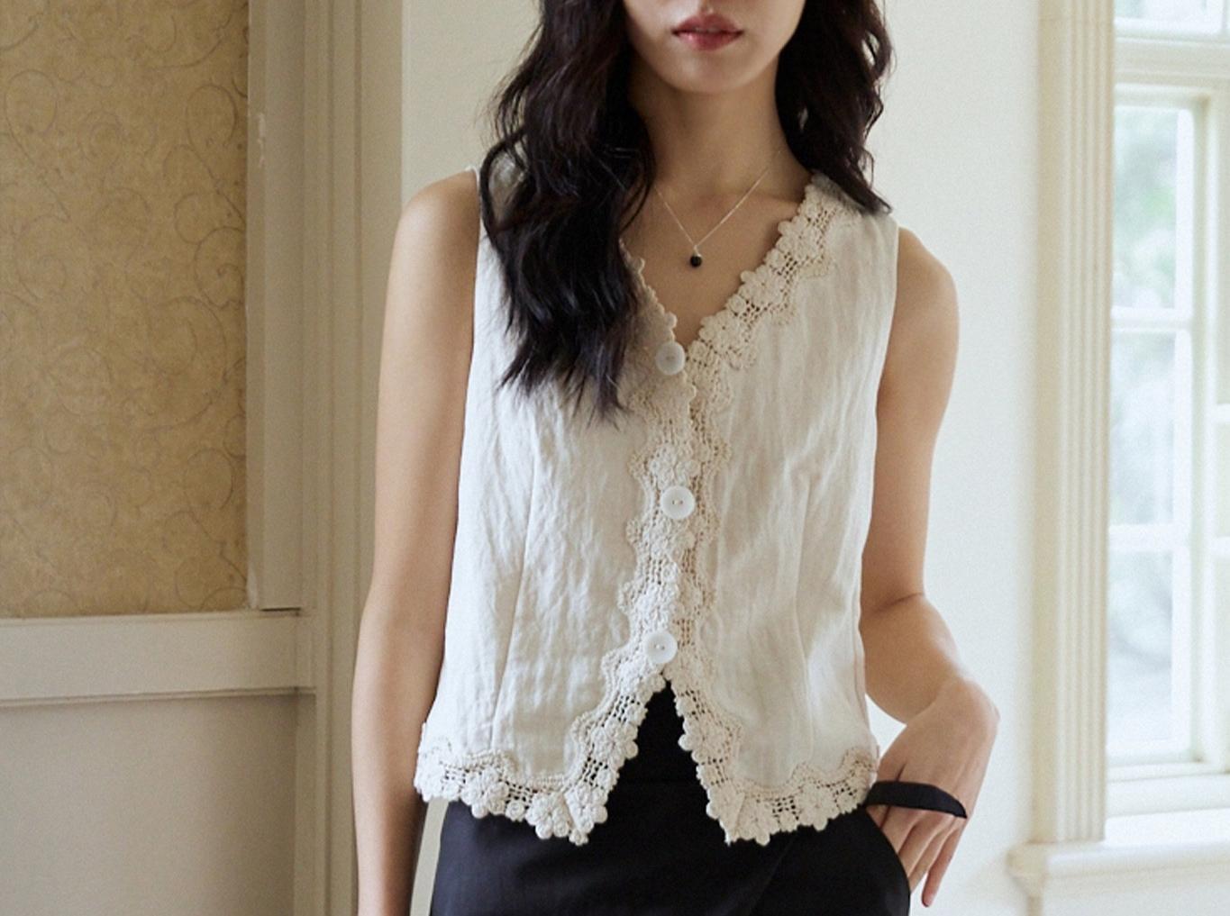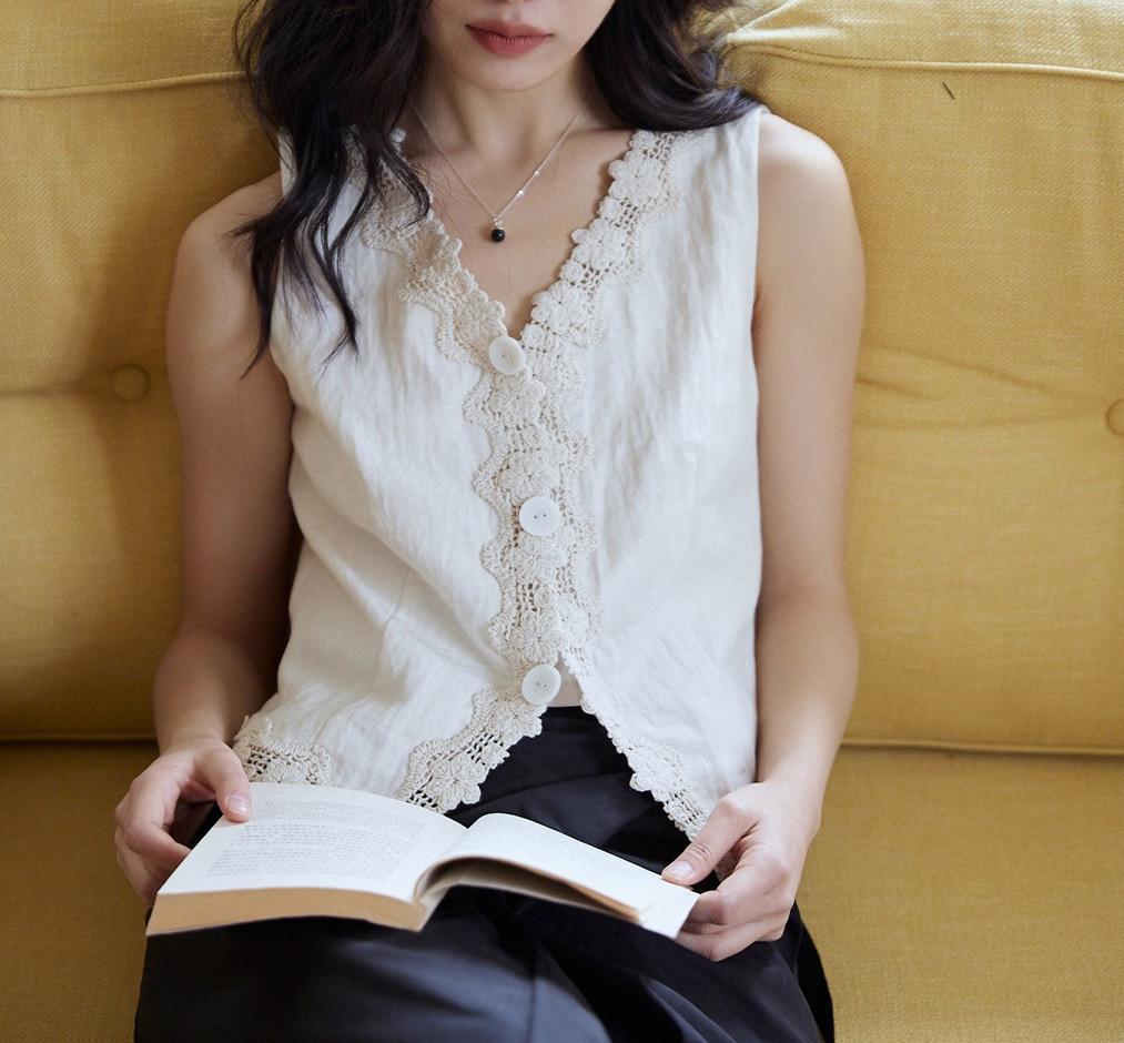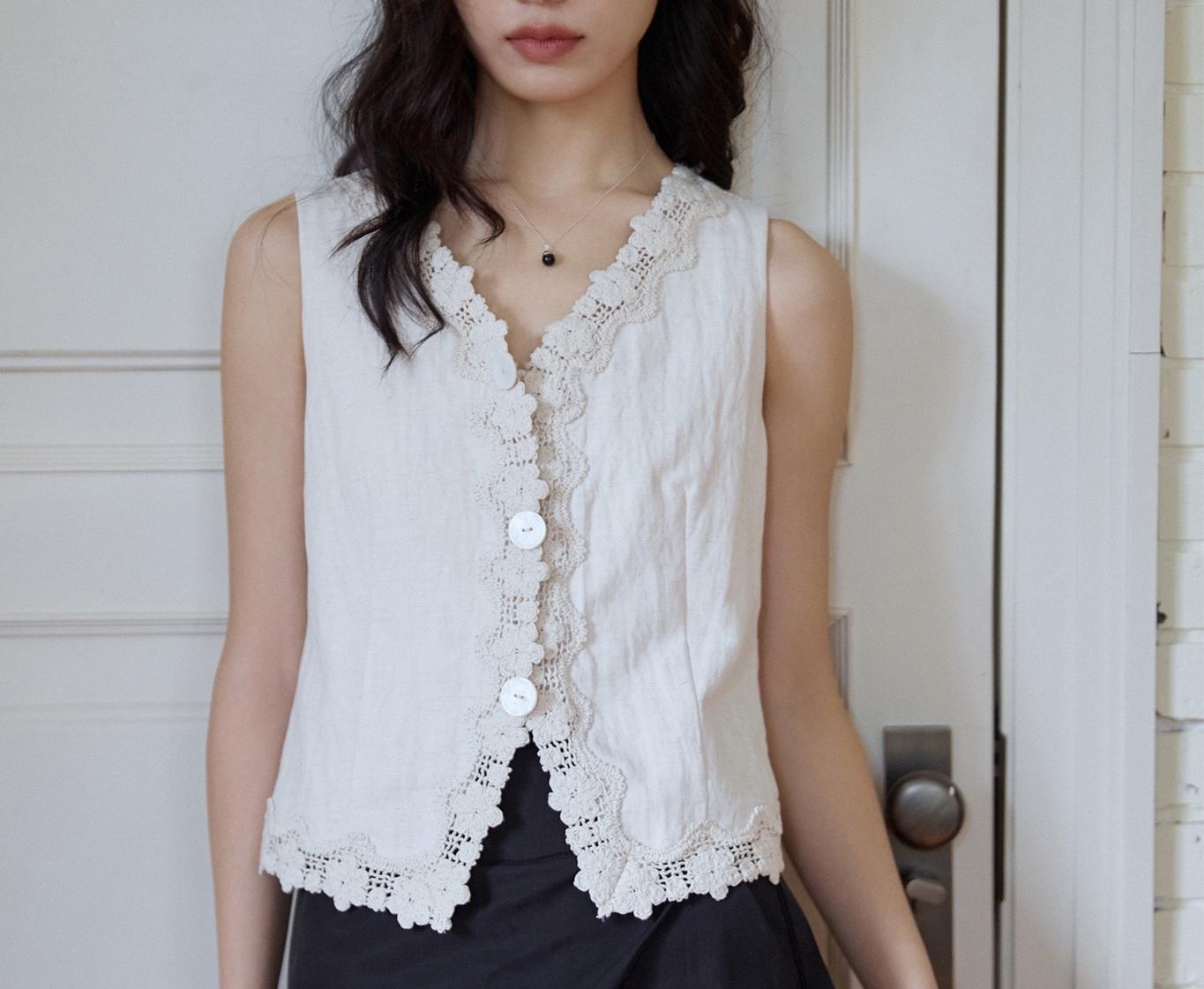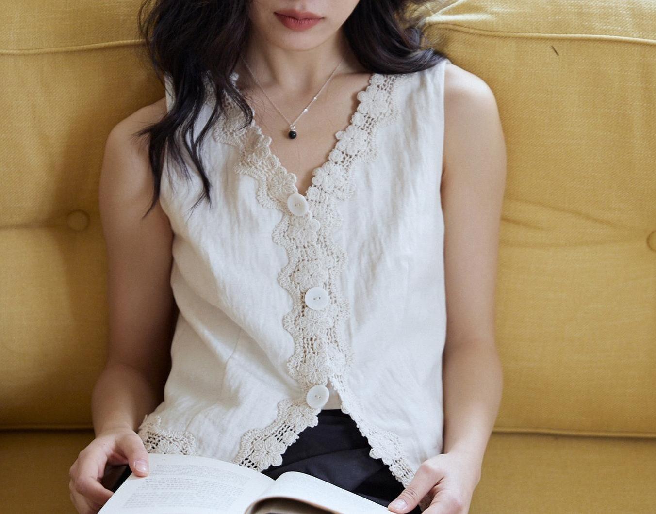 老钱风法式杏色蕾丝花边v领女夏设计感衬衫无袖褶皱肌理上衣