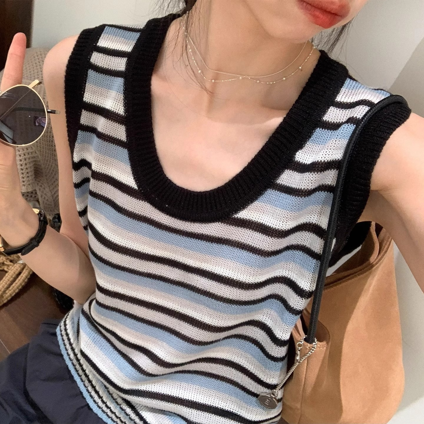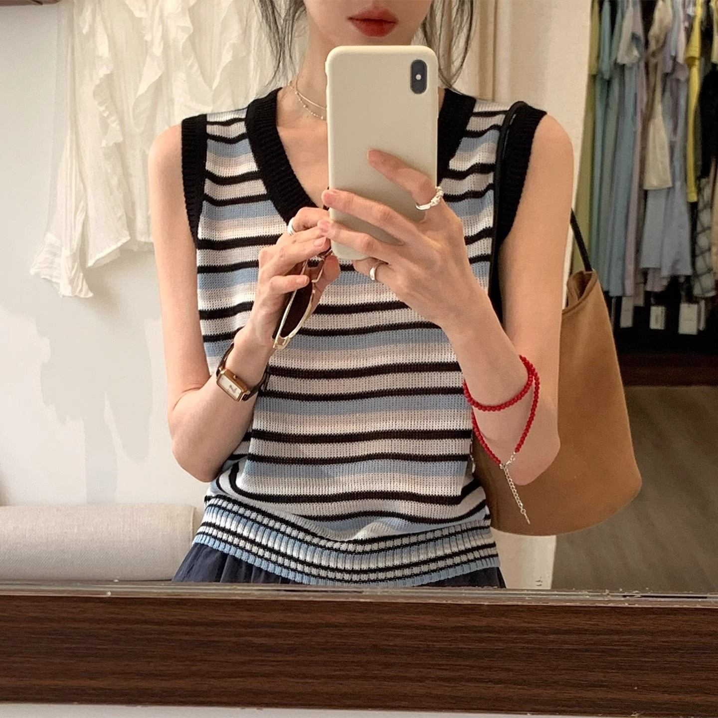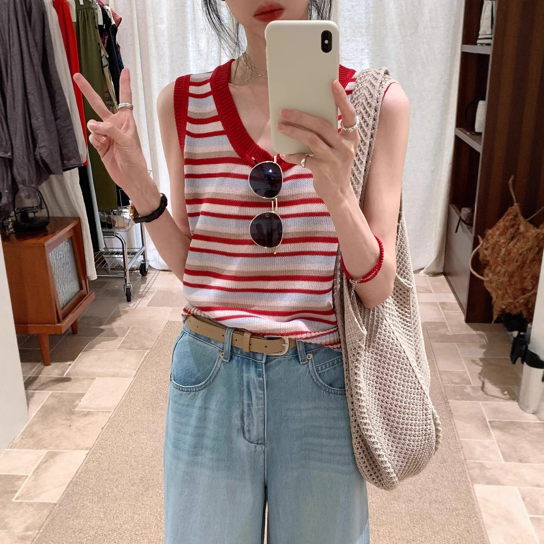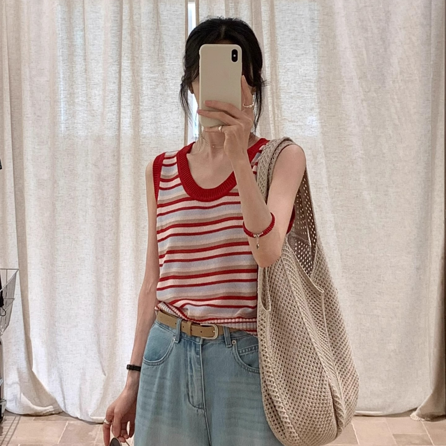 红色条纹无袖针织衫吊带背心女2025夏季小众别致小个子上衣