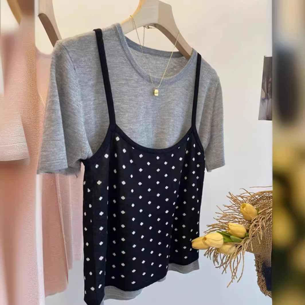 时髦小众设计感圆领针织衫短袖百搭吊带背心女春夏新款两件套