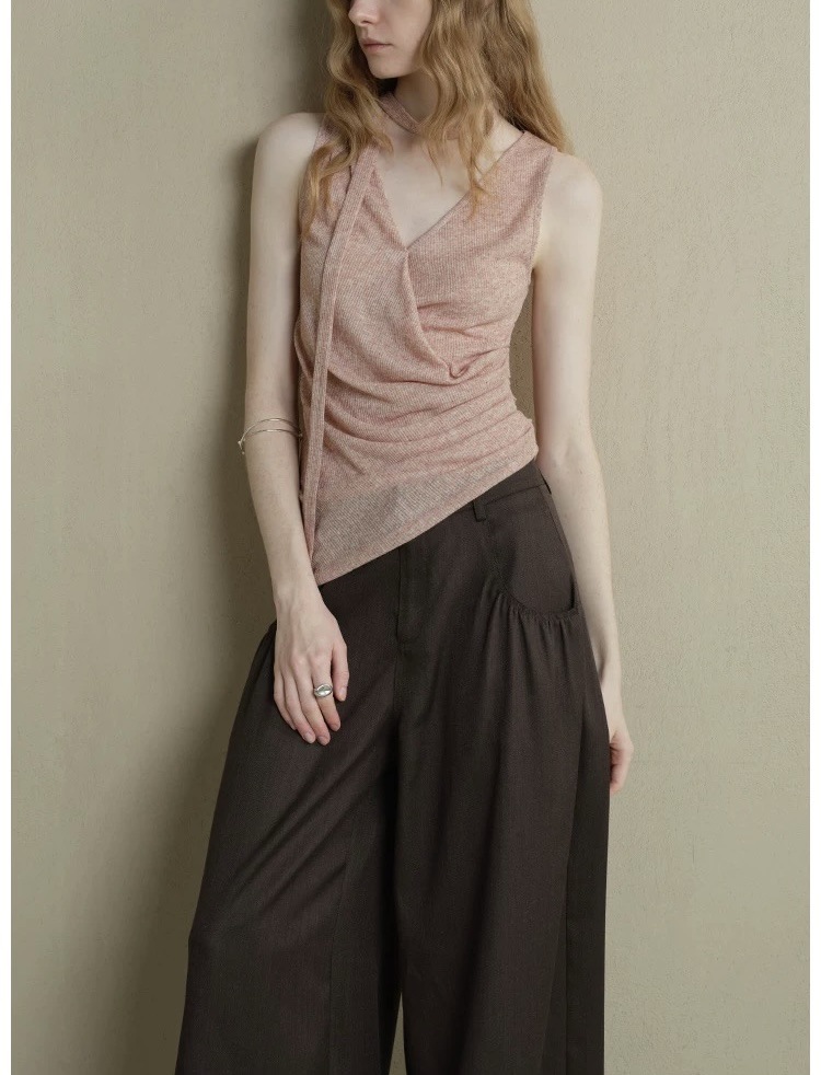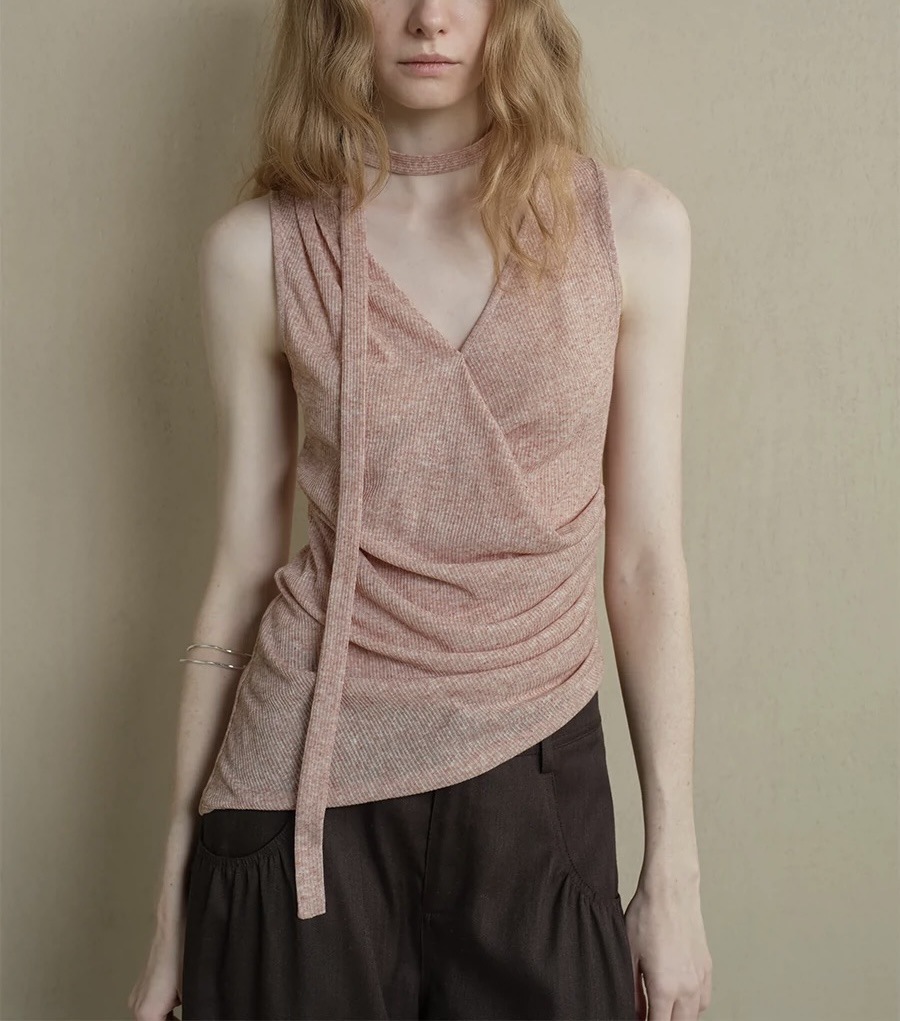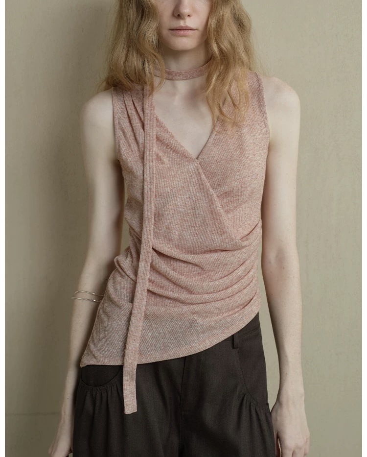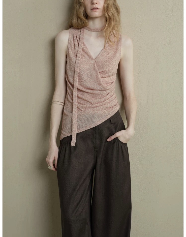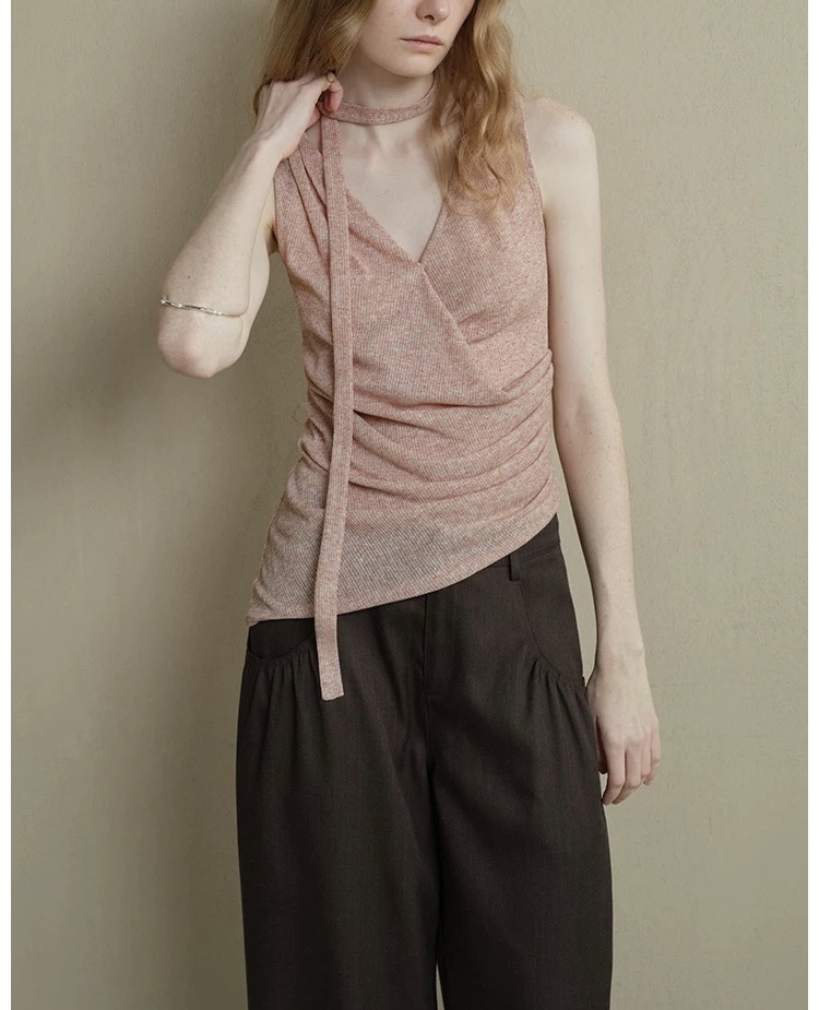 不对称下摆设计侧腰收褶飘带背心吊带挂脖上衣