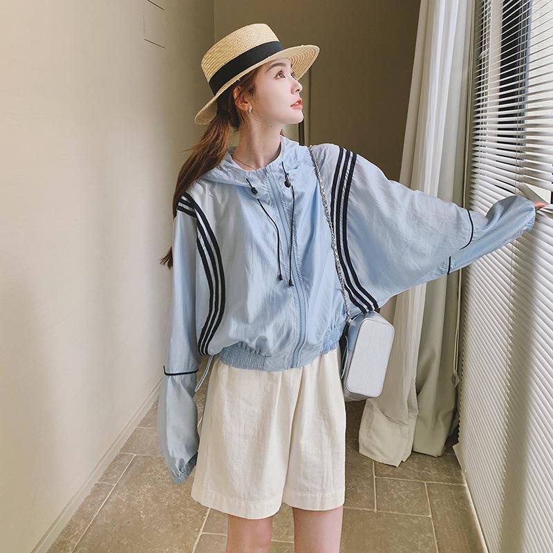 实拍下摆松紧宽松百搭休闲减龄浅蓝色短款显瘦拉链连帽防晒外套女