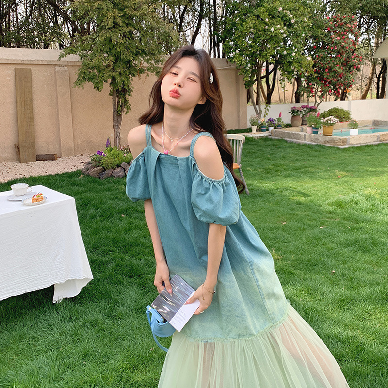 设计感渐变色露肩牛仔连衣裙夏季新款法式绝美网纱拼接度假长裙子