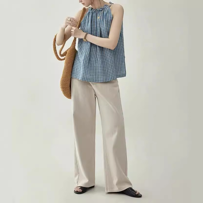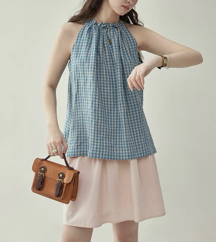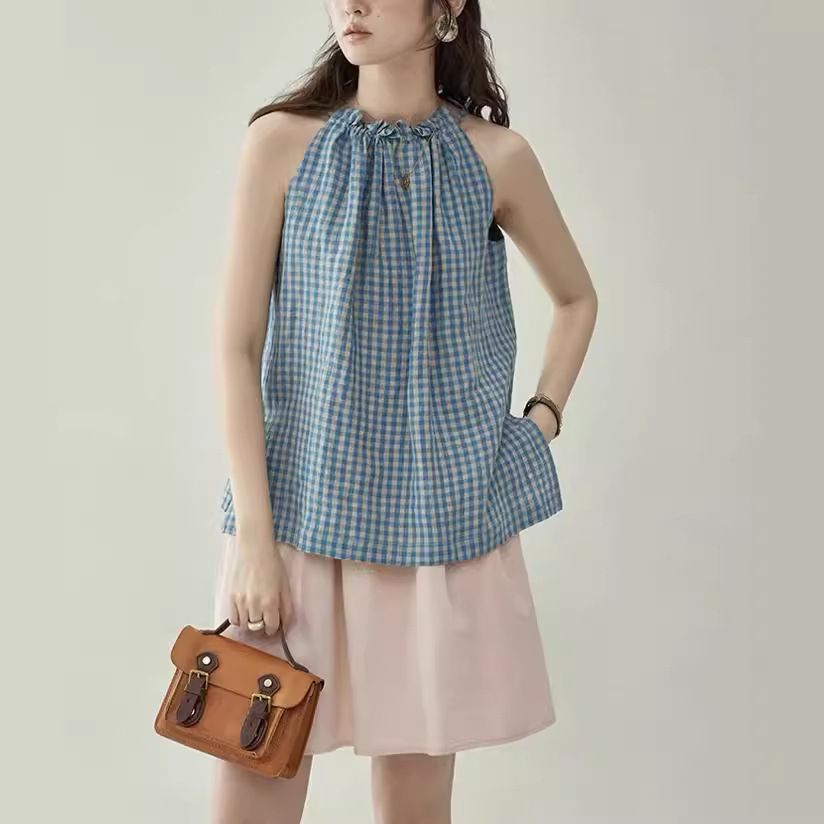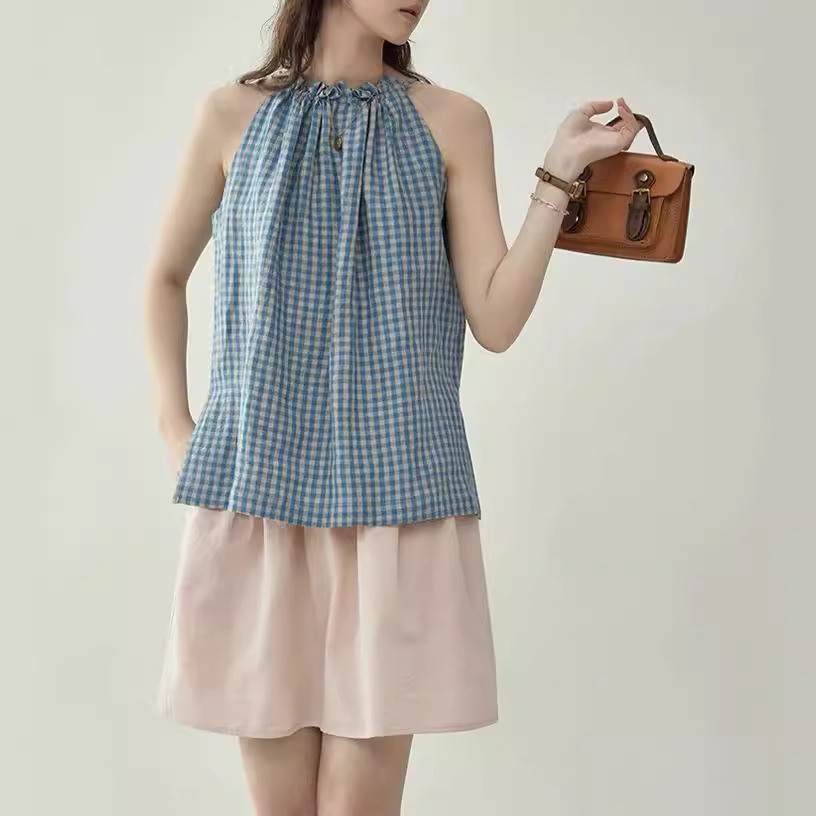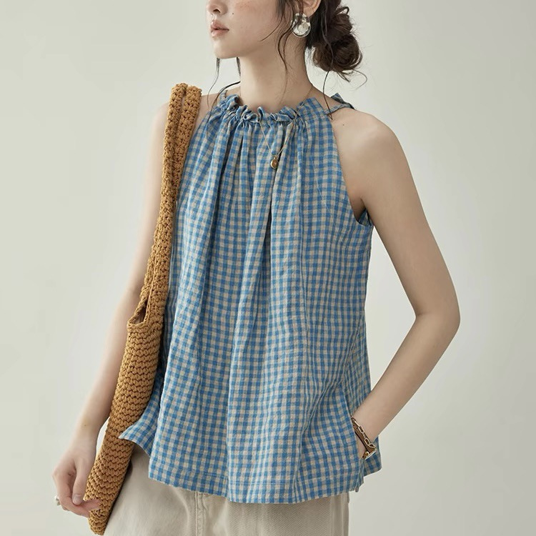 北岛超爽透气复古格子抽绳无袖背心衬衫女夏季上衣