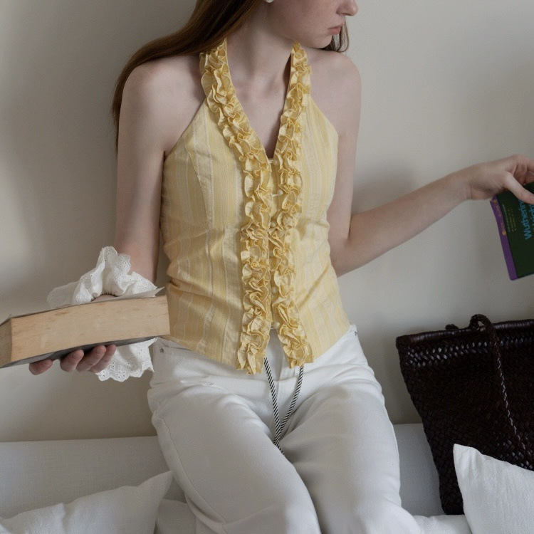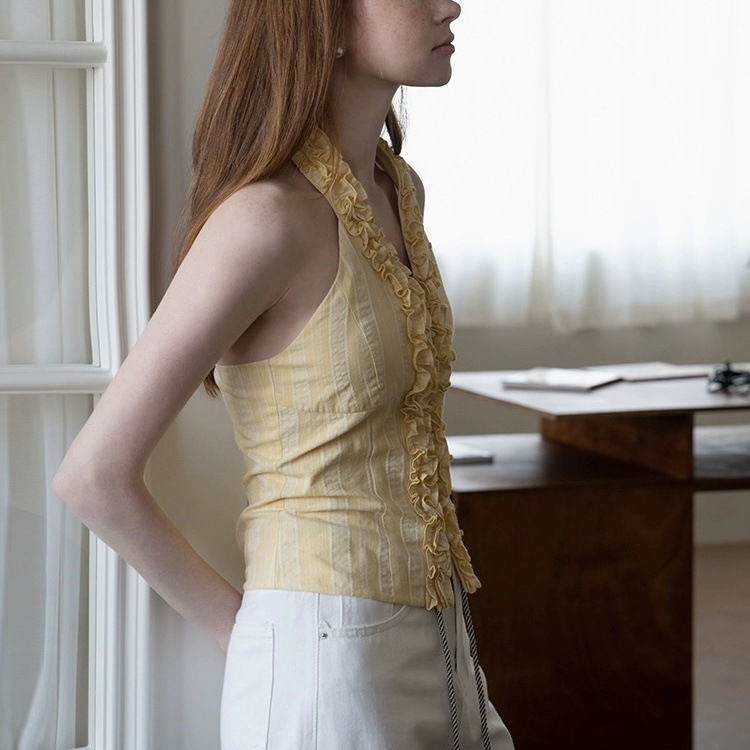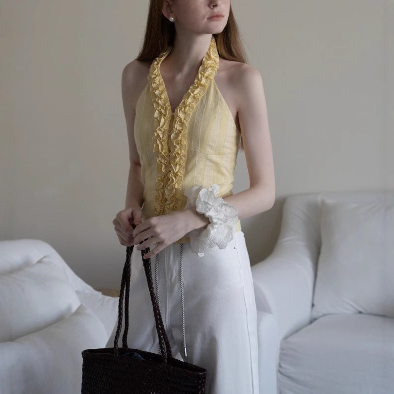 黄色木耳边挂脖背心吊带夏新款修身气质显瘦度假风外穿上衣