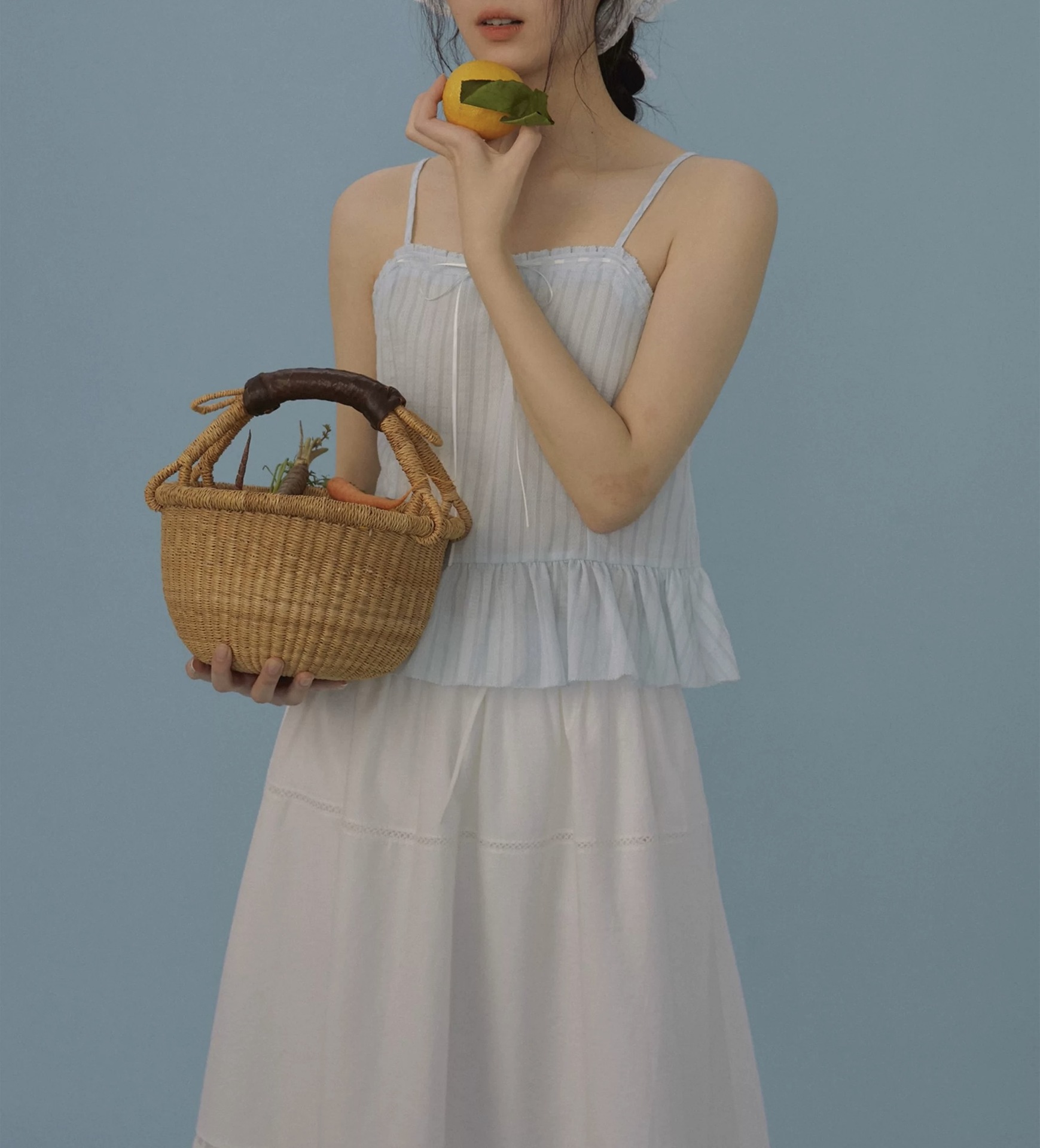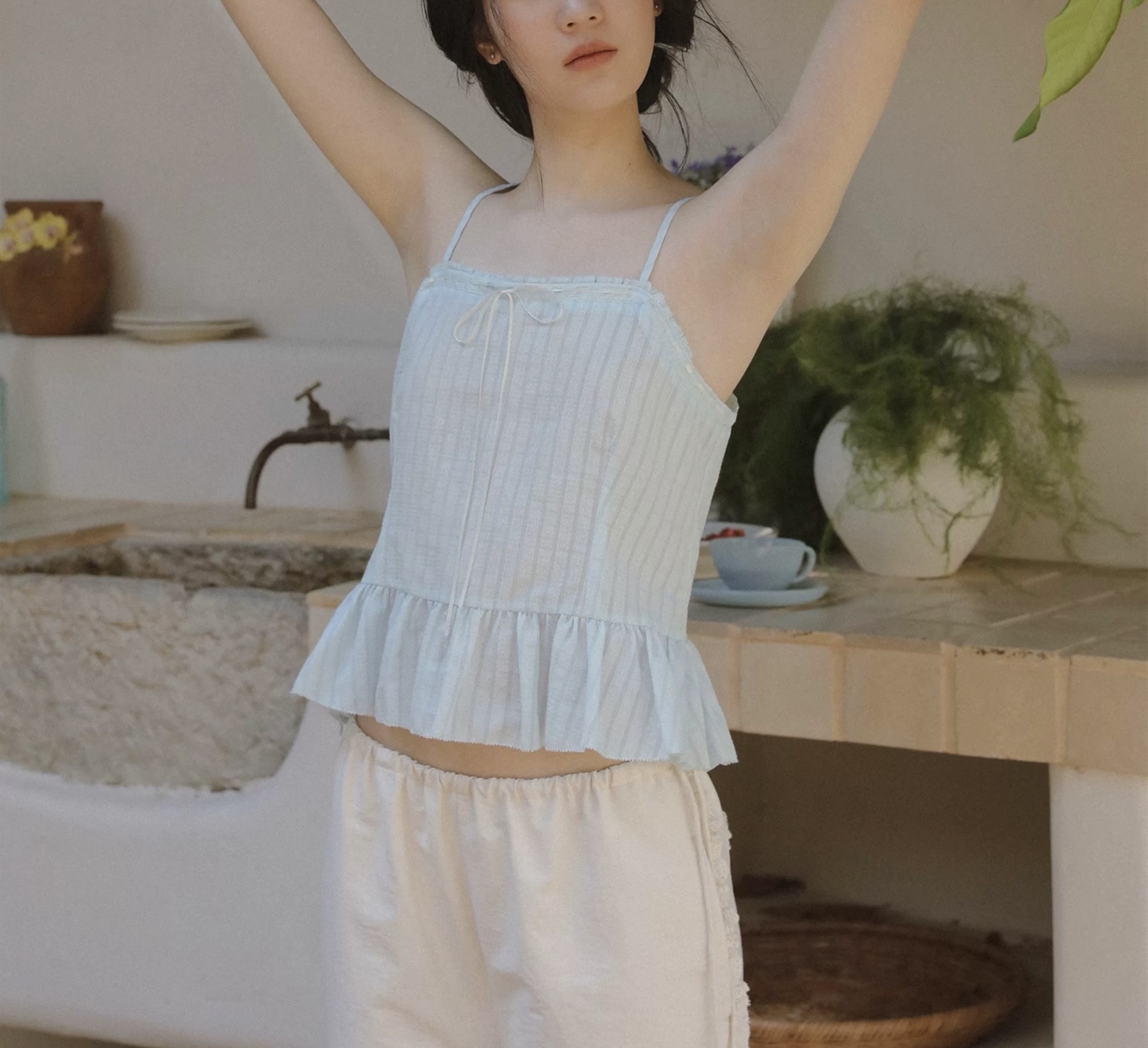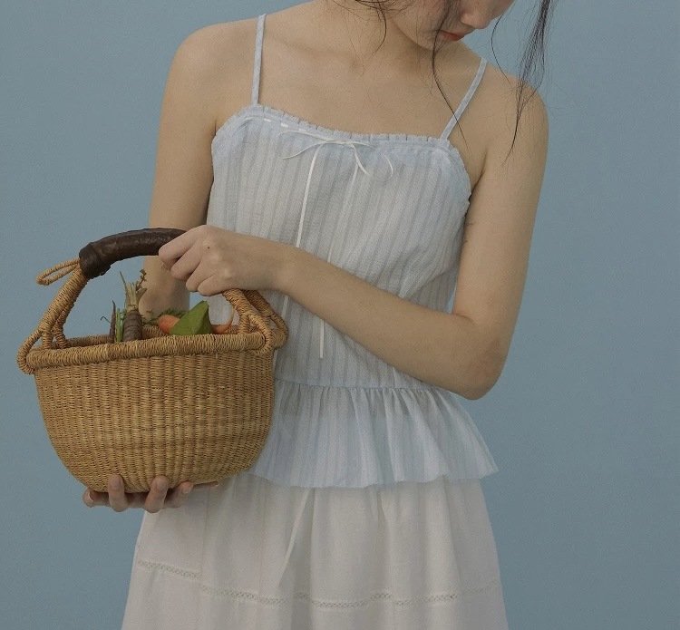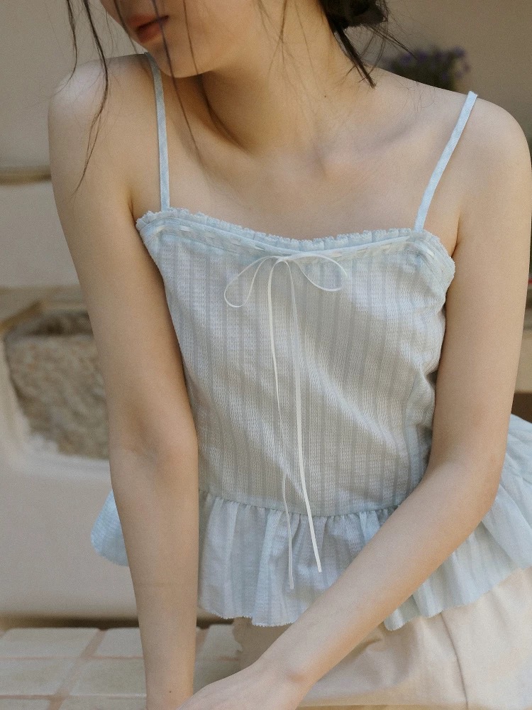 LANO 条纹波浪边吊带上衣复古法式海盐荷叶边背心内搭外穿女夏季