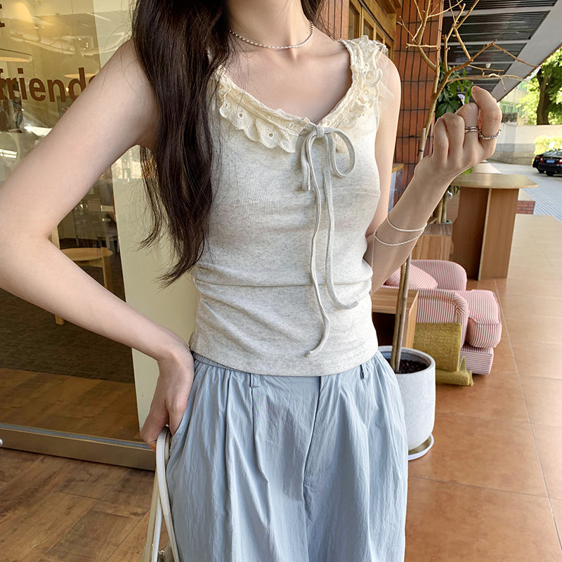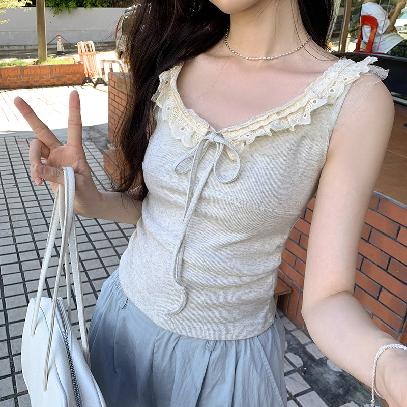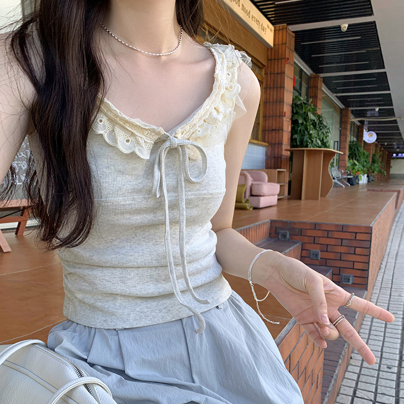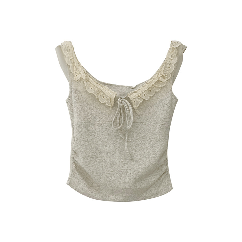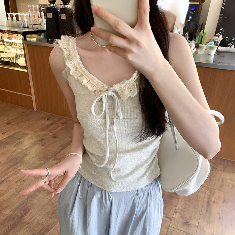 法式设计感蕾丝边系带背心女夏甜辣小众收腰抽褶显瘦上衣